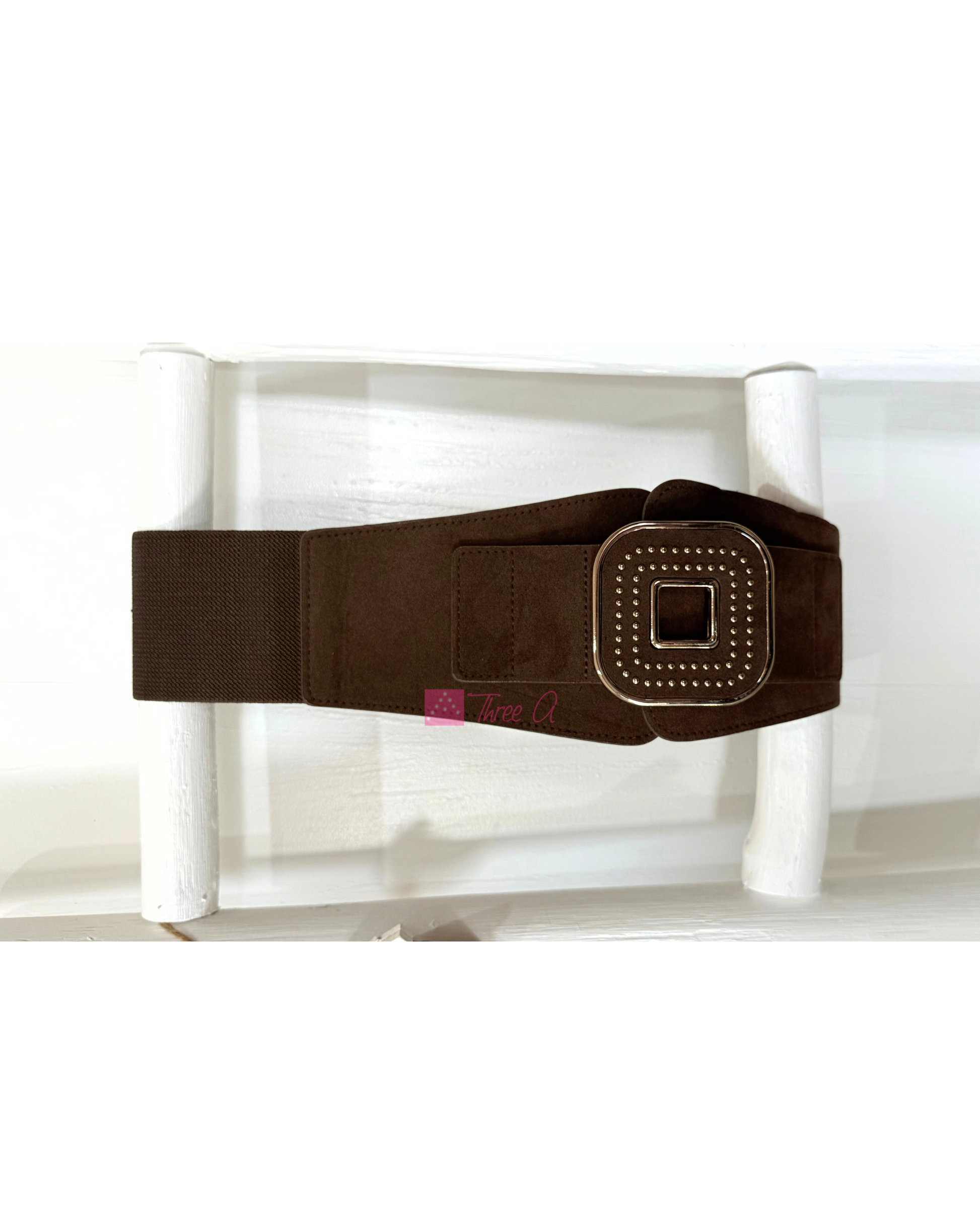 Cinturón de Antelina Ysa con tachuelas en dorado, ajustable a la cintura, lleva goma en la parte trasera.