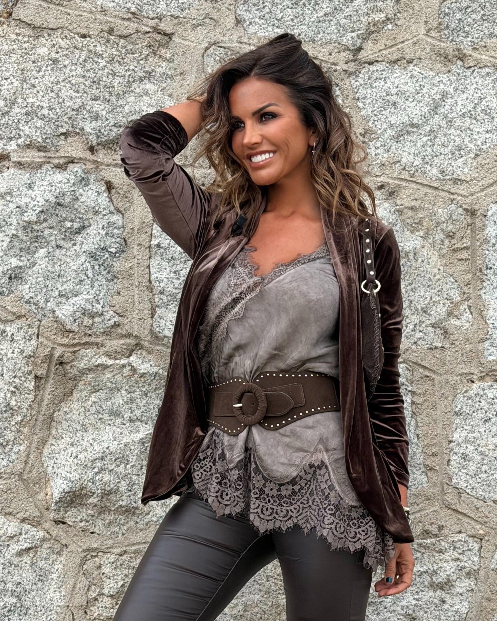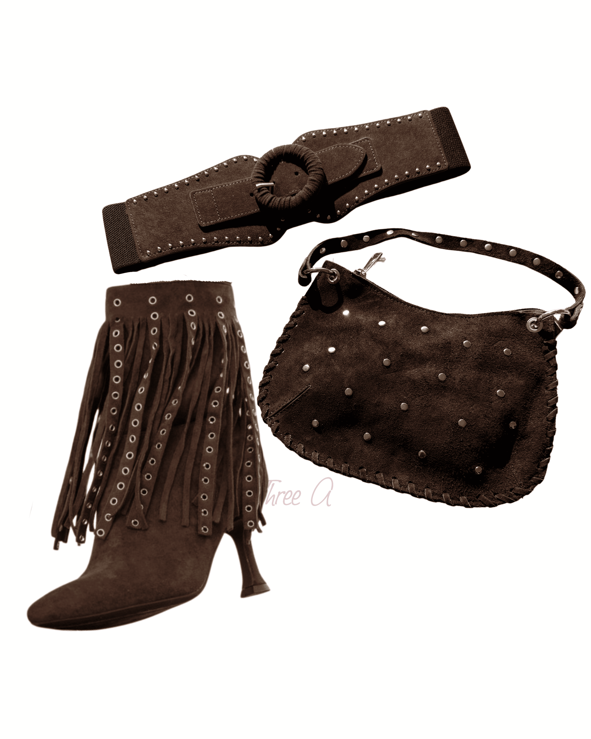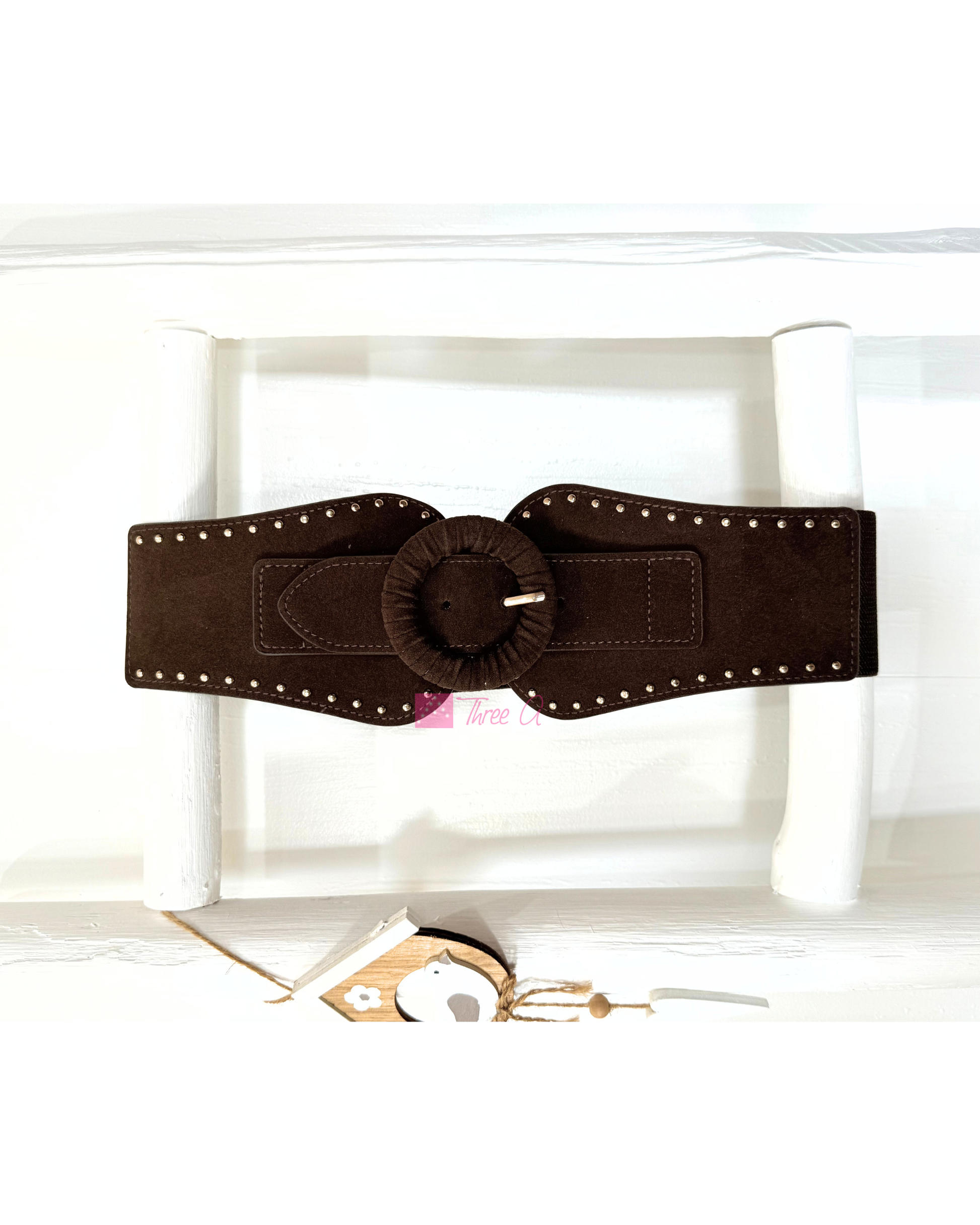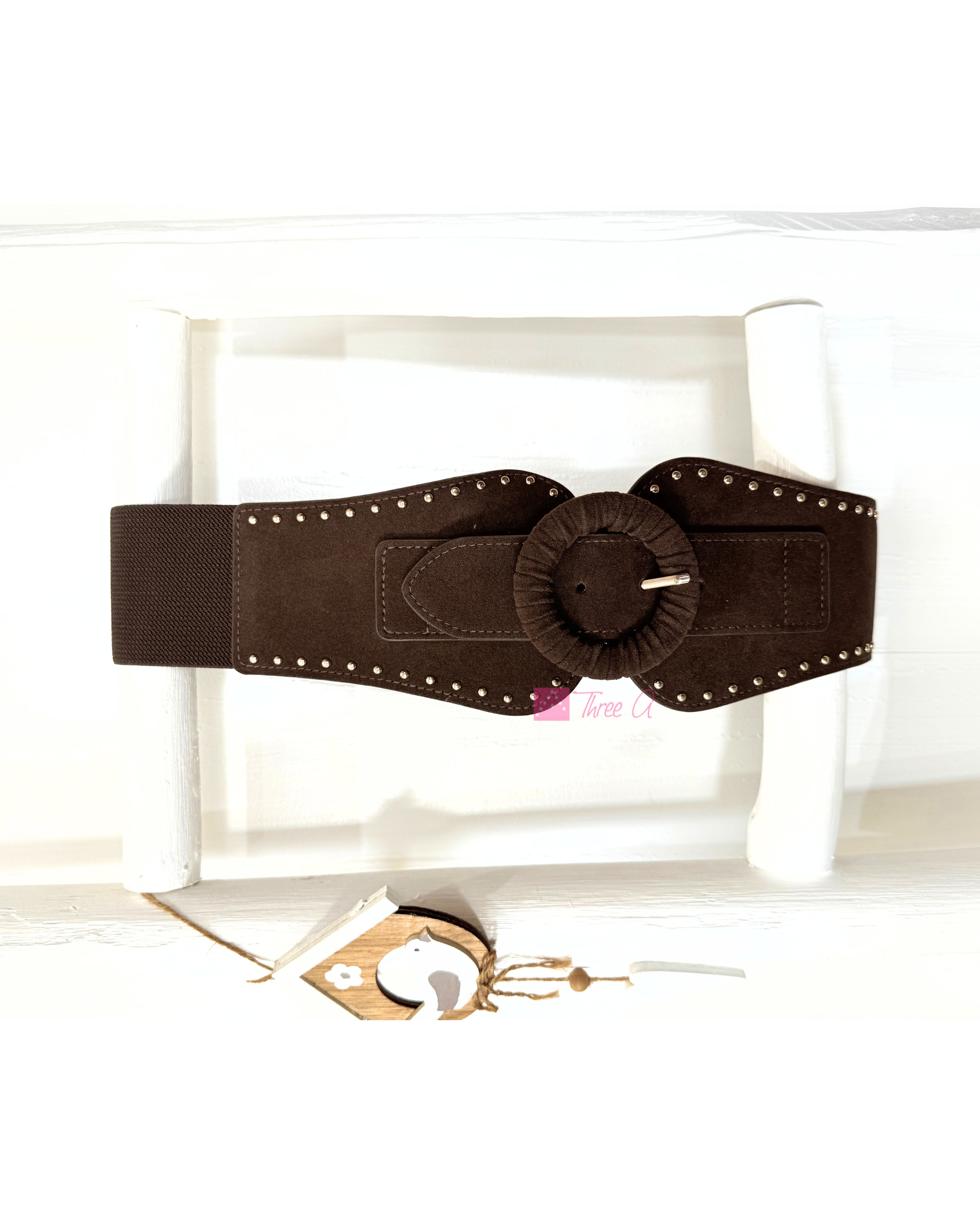 Cinturón de Antelina Ysa con tachuelas en dorado, ajustable a la cintura, lleva goma en la parte trasera.
