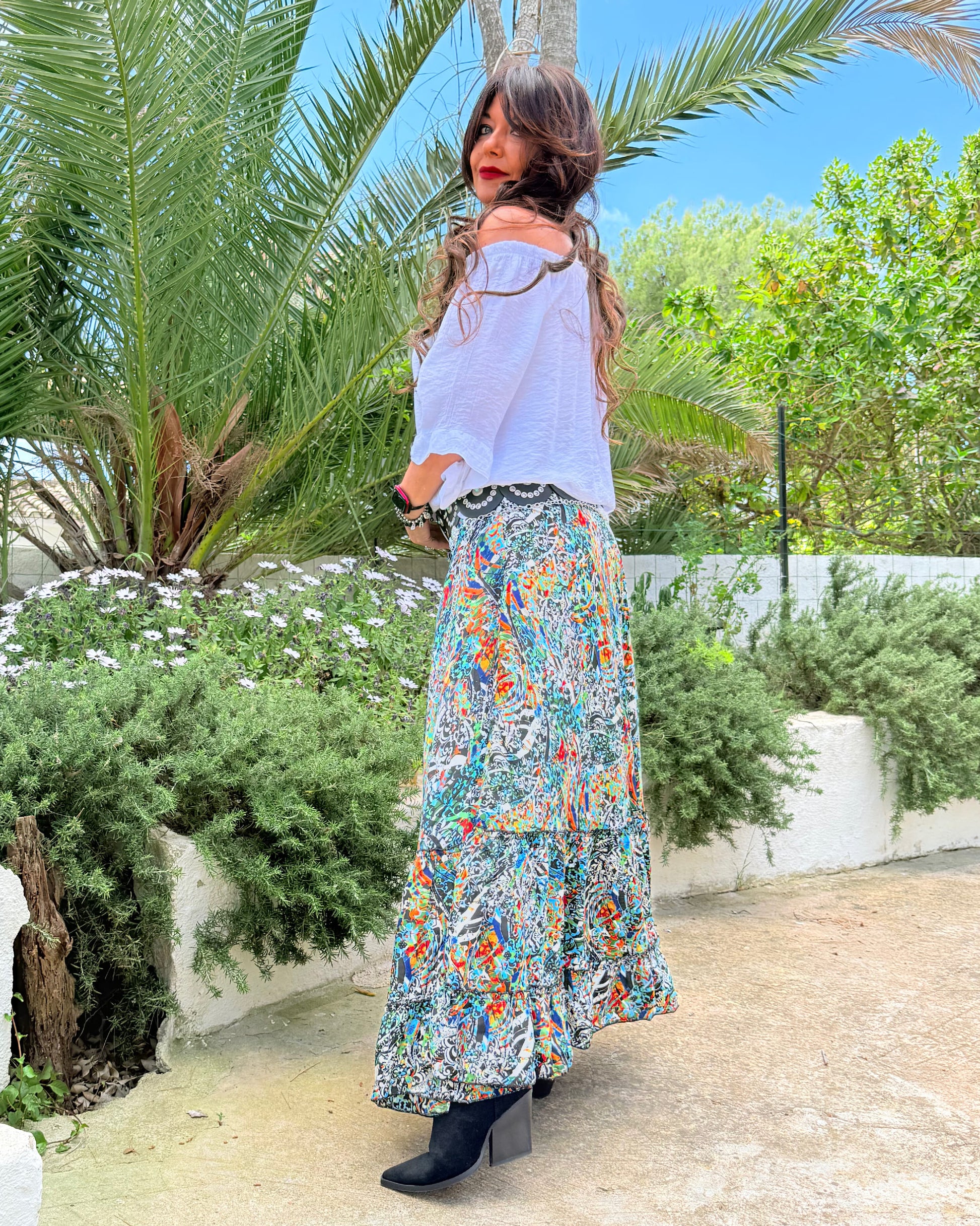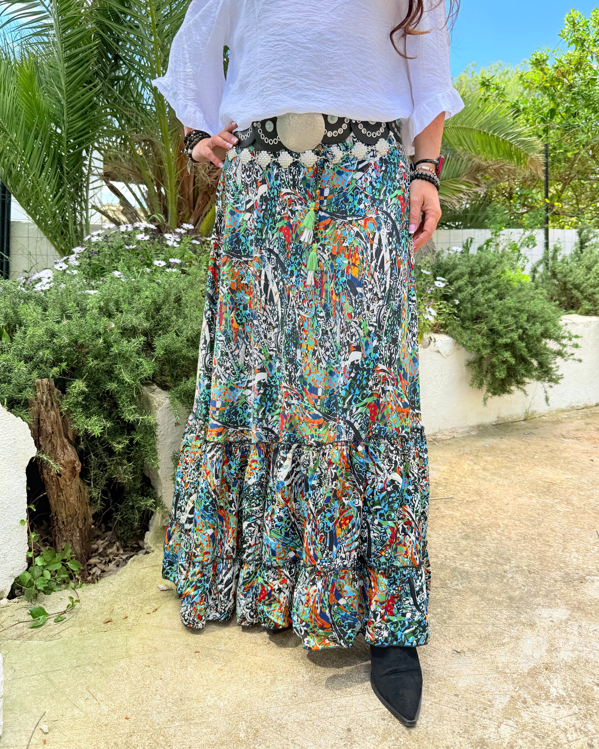 Espectacular Falda Odely estampada, prenda muy fluida. Goma en la parte de atrás y cordón para anudar al gusto, da talla.