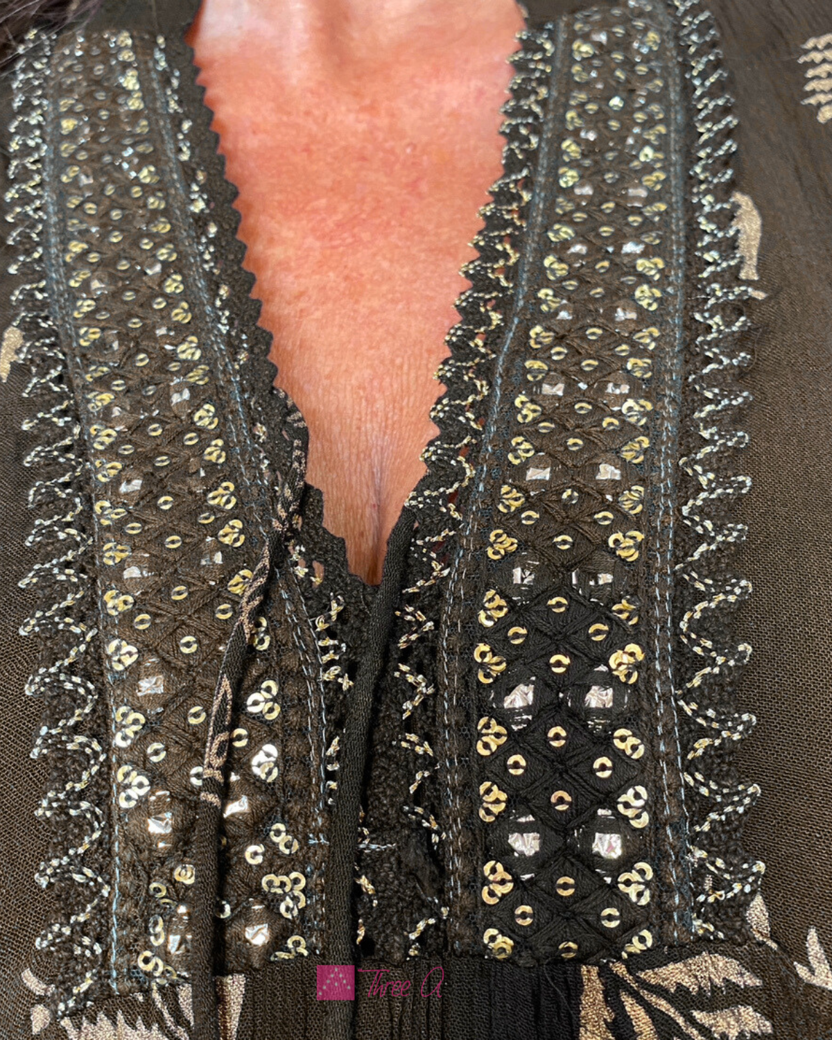 V-Ausschnitt mit Paillettendetails, Stickerei und Spitze mit Pompons