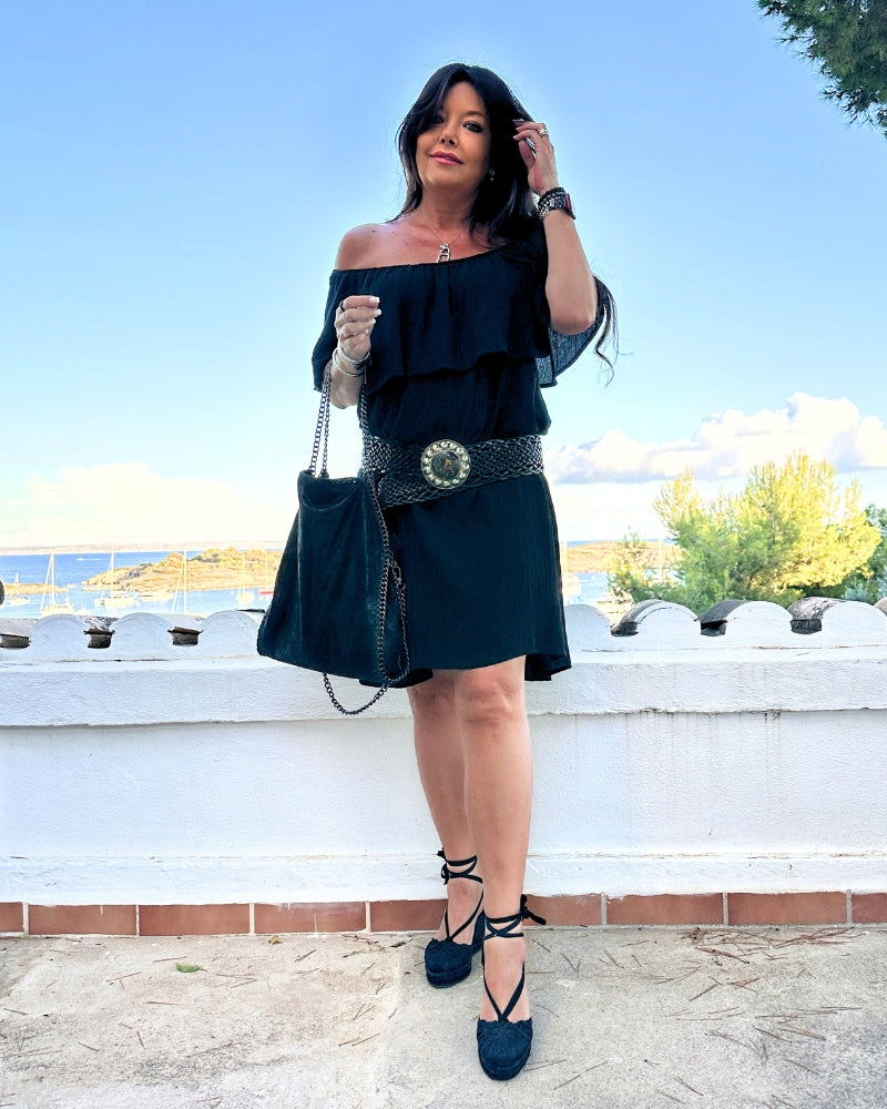 Ideal Vestido Mory para llevar tus hombros al aire, efecto arrugado con un toque brillante muy fino
