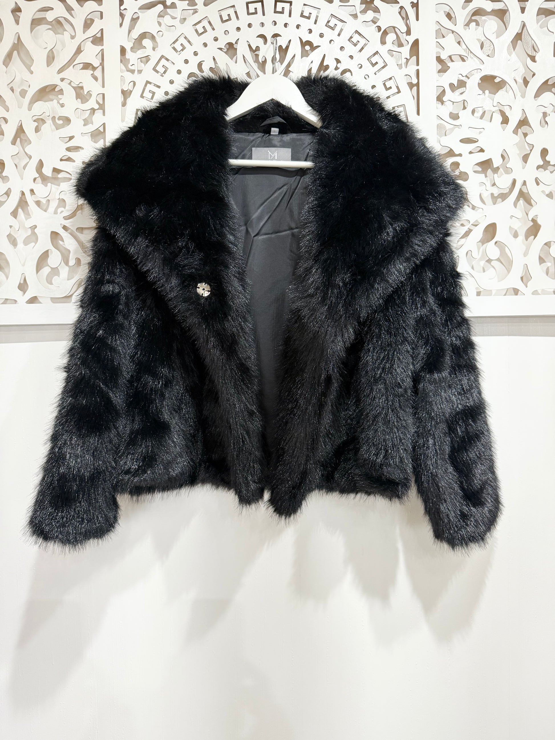 Kery fur jacket, snap button closure, two pockets, lapel collar, lined.