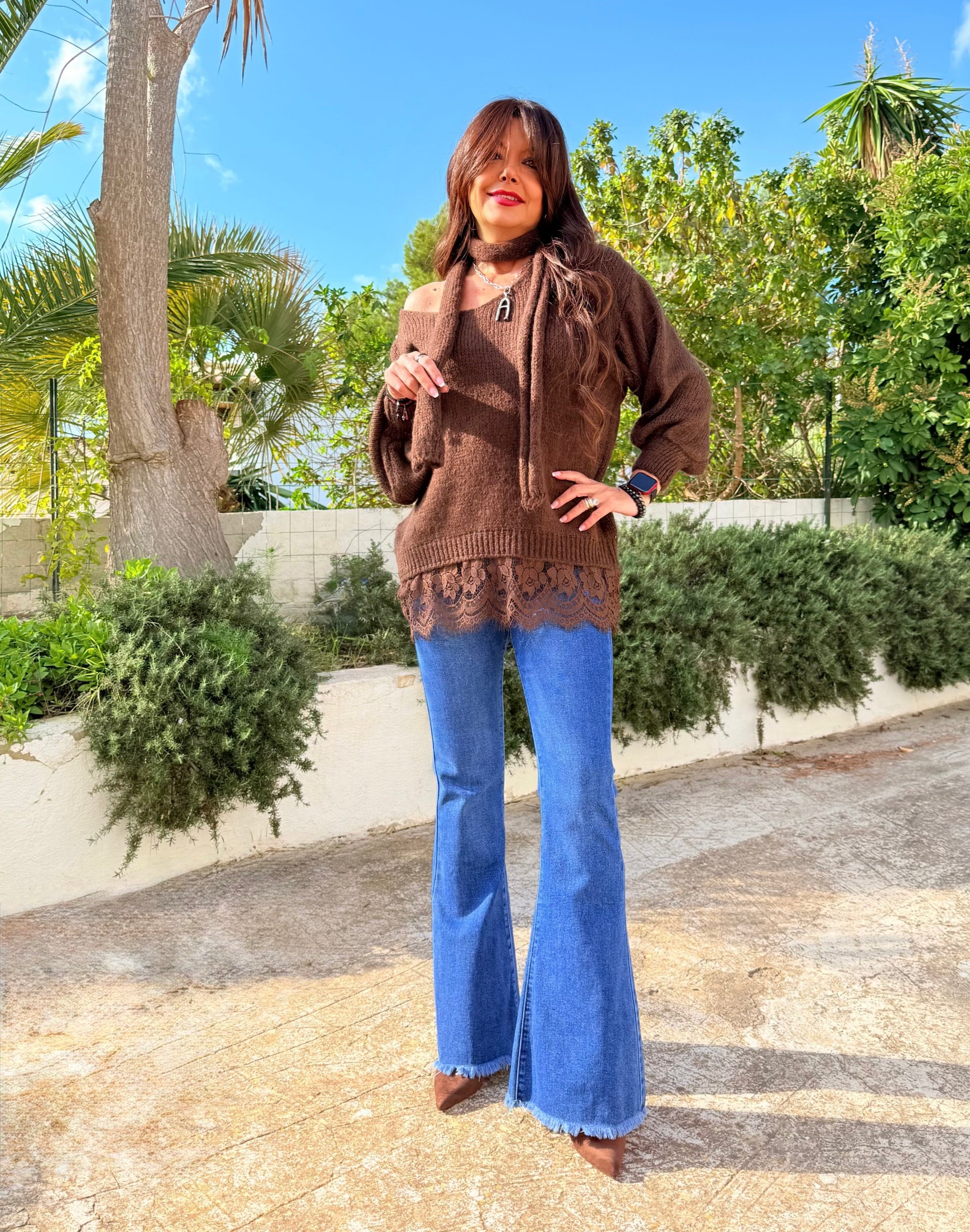 Blond oversized sweater with lace trim at the hem and a wide V-neck. Can be worn off the shoulder. 🎁Matching scarf included as a gift.