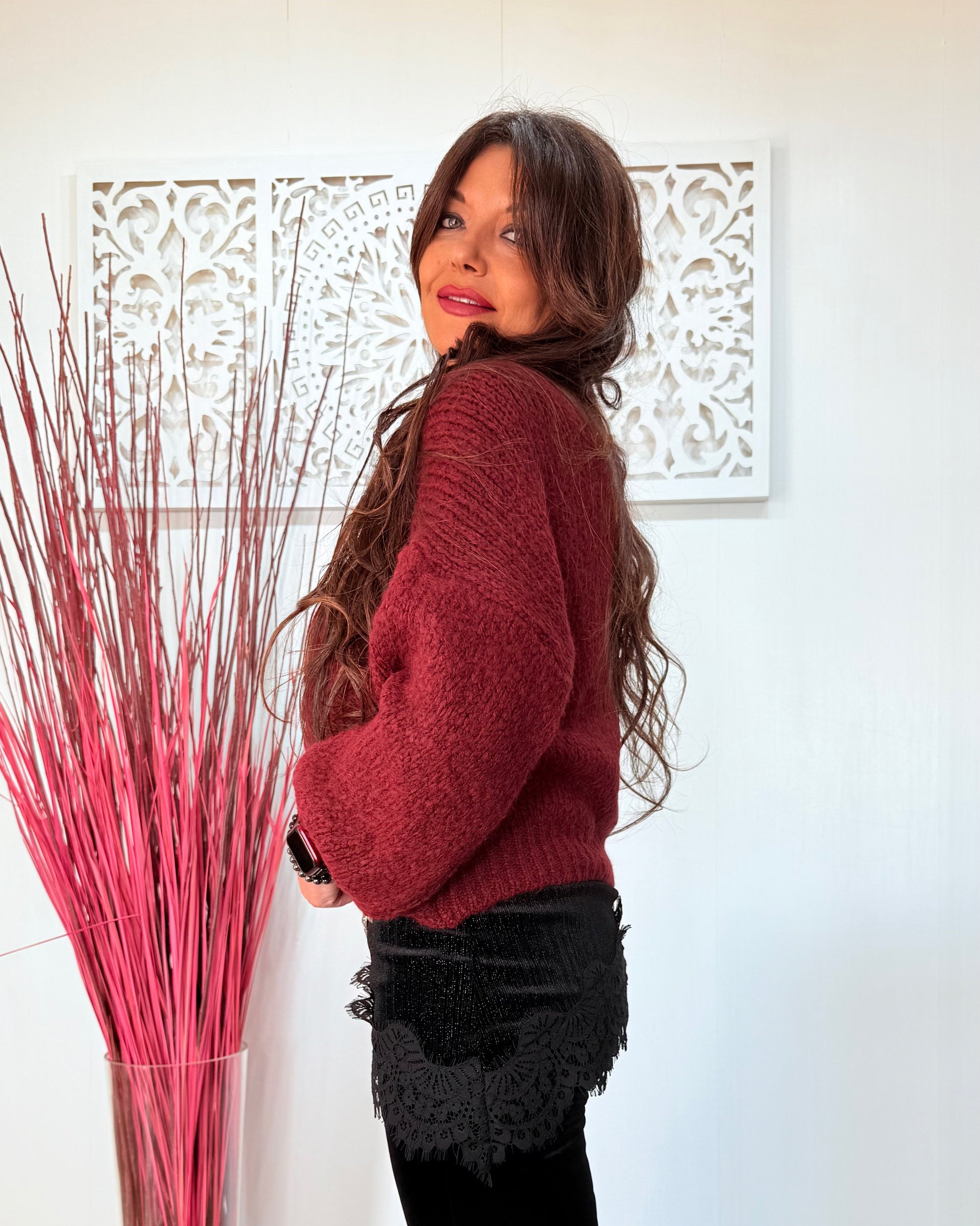 Original Sayoa sweater with interlaced front, V-neck, and slightly puffed sleeves. The hem can be worn open or closed, depending on your preference.