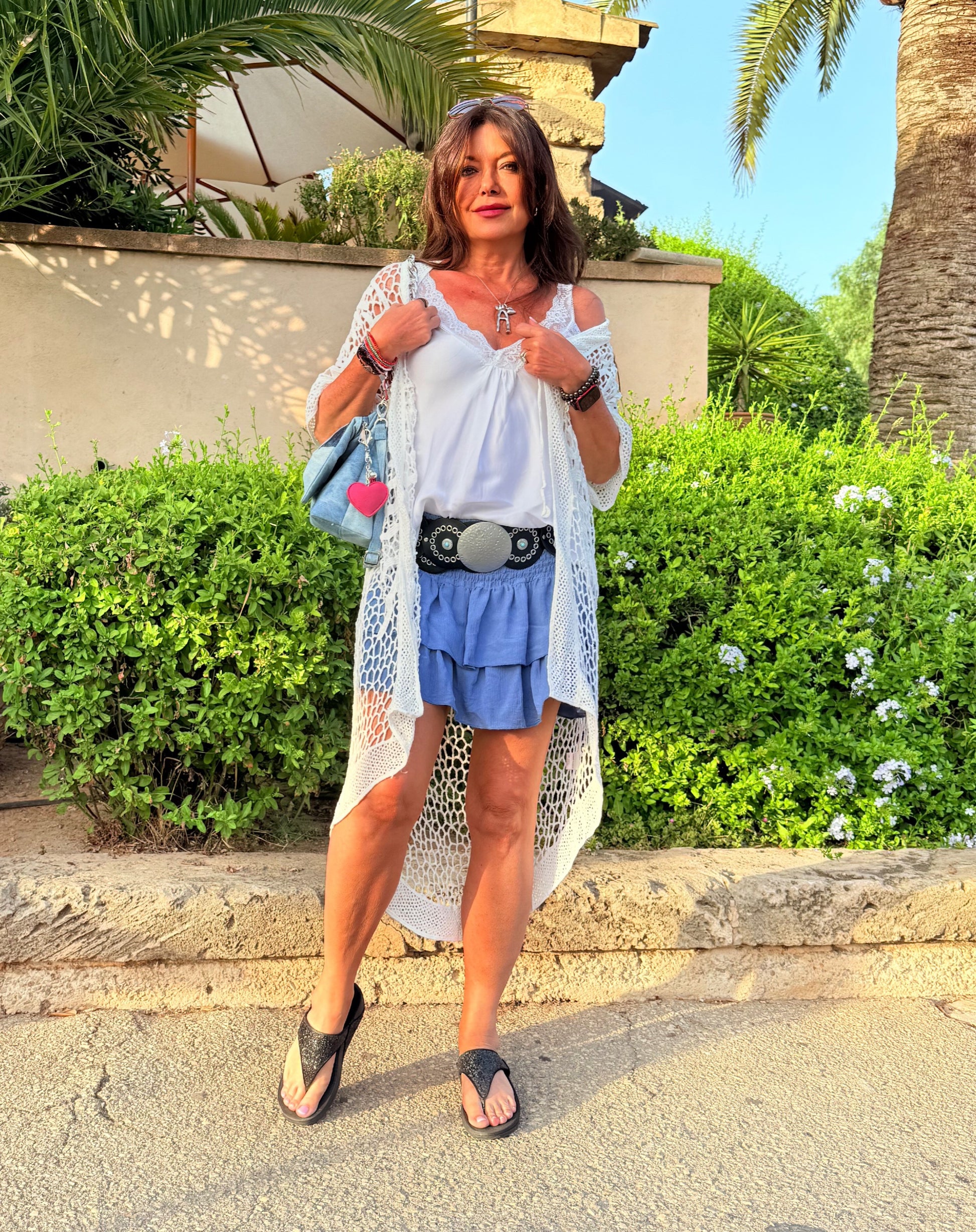 Maly Crochet Kimono, shorter at the front than at the back, with a drawstring to tie.
