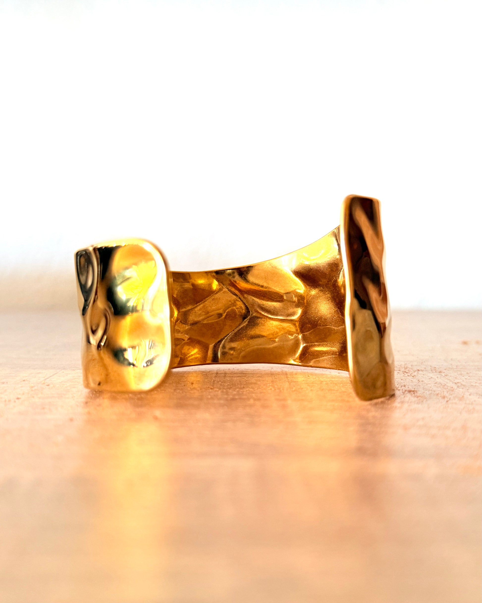 Bracciale Sea, dorato, in acciaio con ondulazioni, irregolare, parte larga 4 cm, parte stretta 2,5 cm, regolabile.