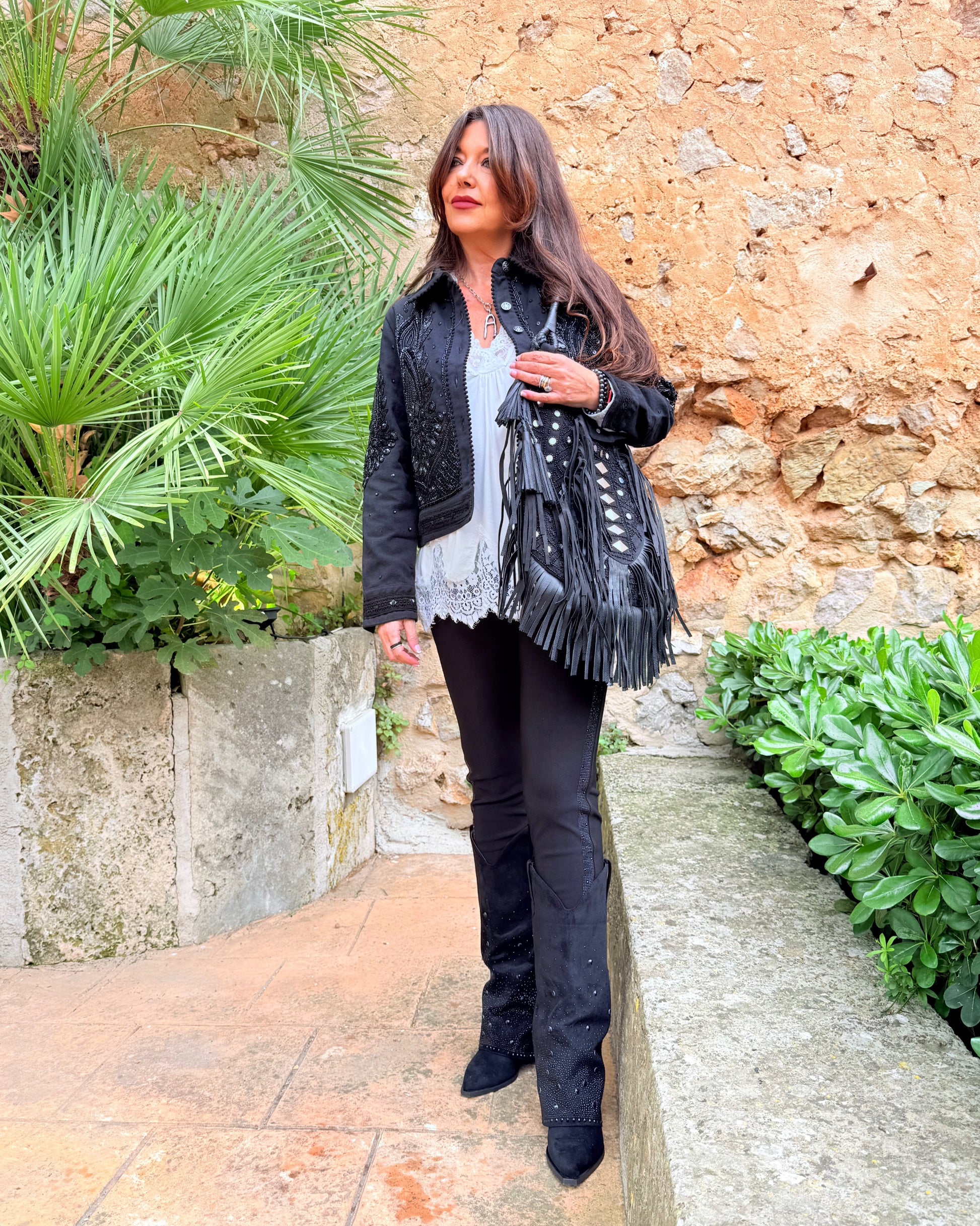 Maglietta con scollo a V con pizzo sullo scollo, sul fondo e sui polsini. Maniche lunghe.