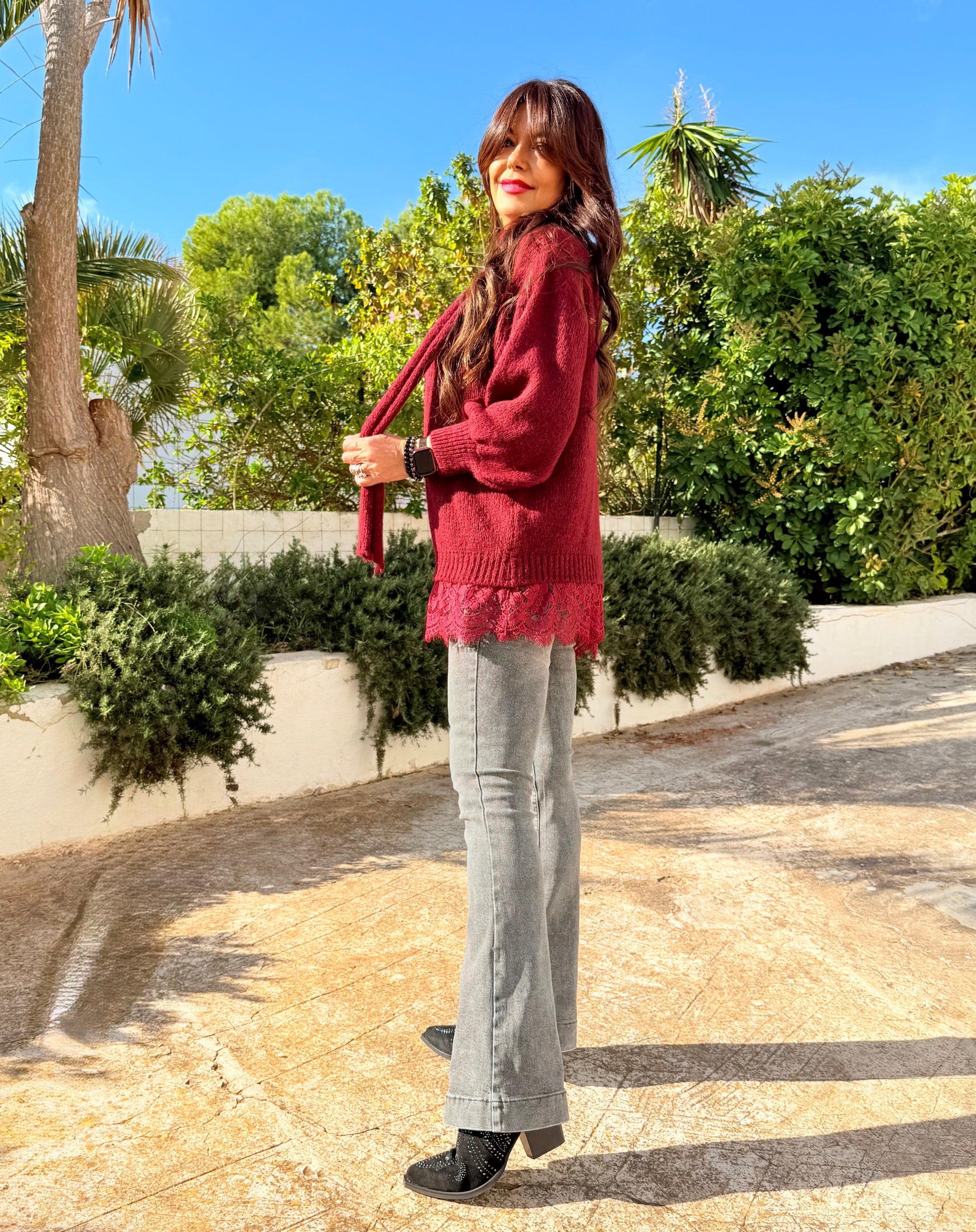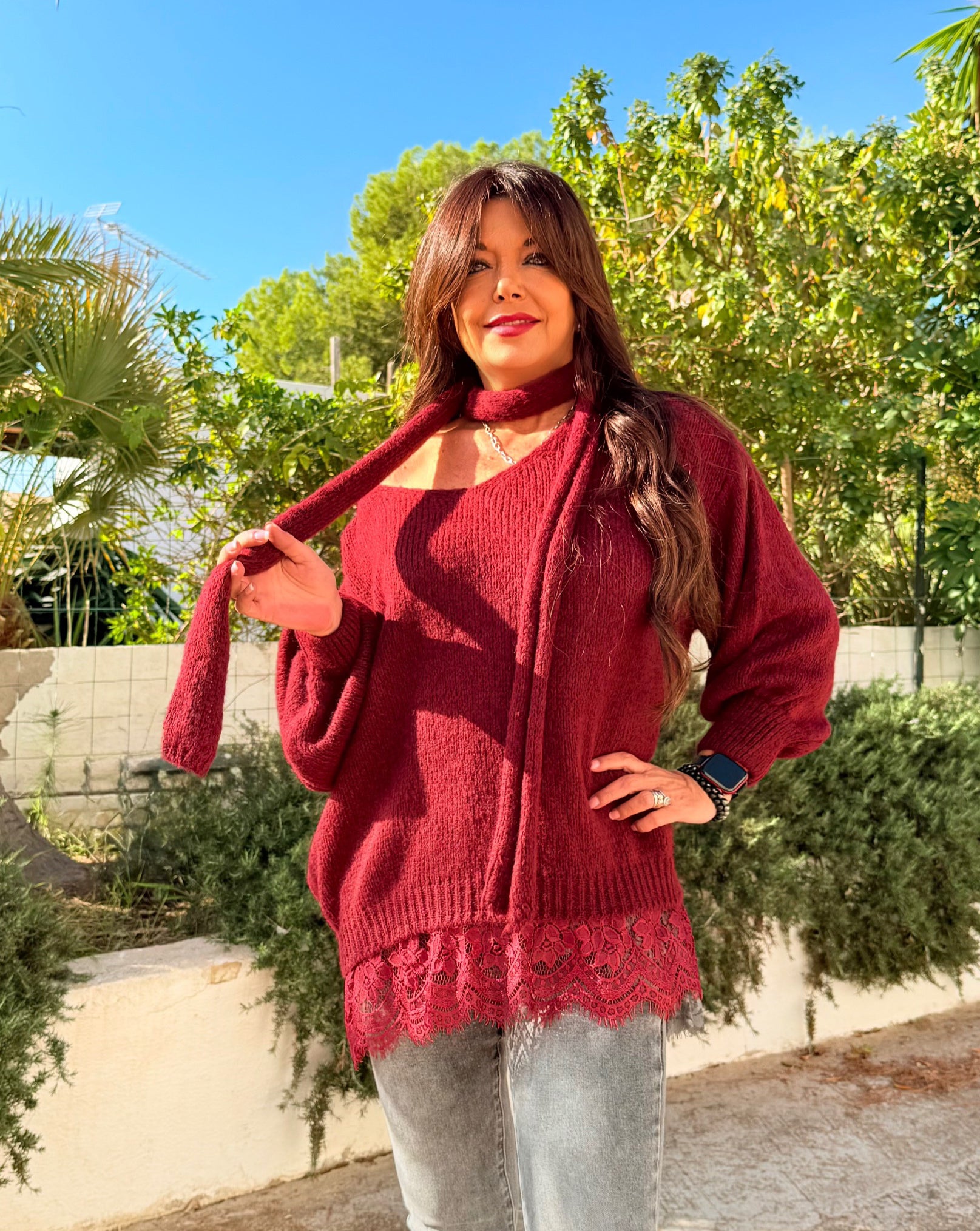 Jersey Blond, tipo oversize con blonda en el bajo, amplio cuello de pico, lo puedes llevar caído hombro. 🎁Regalo de la bufanda a conjunto.