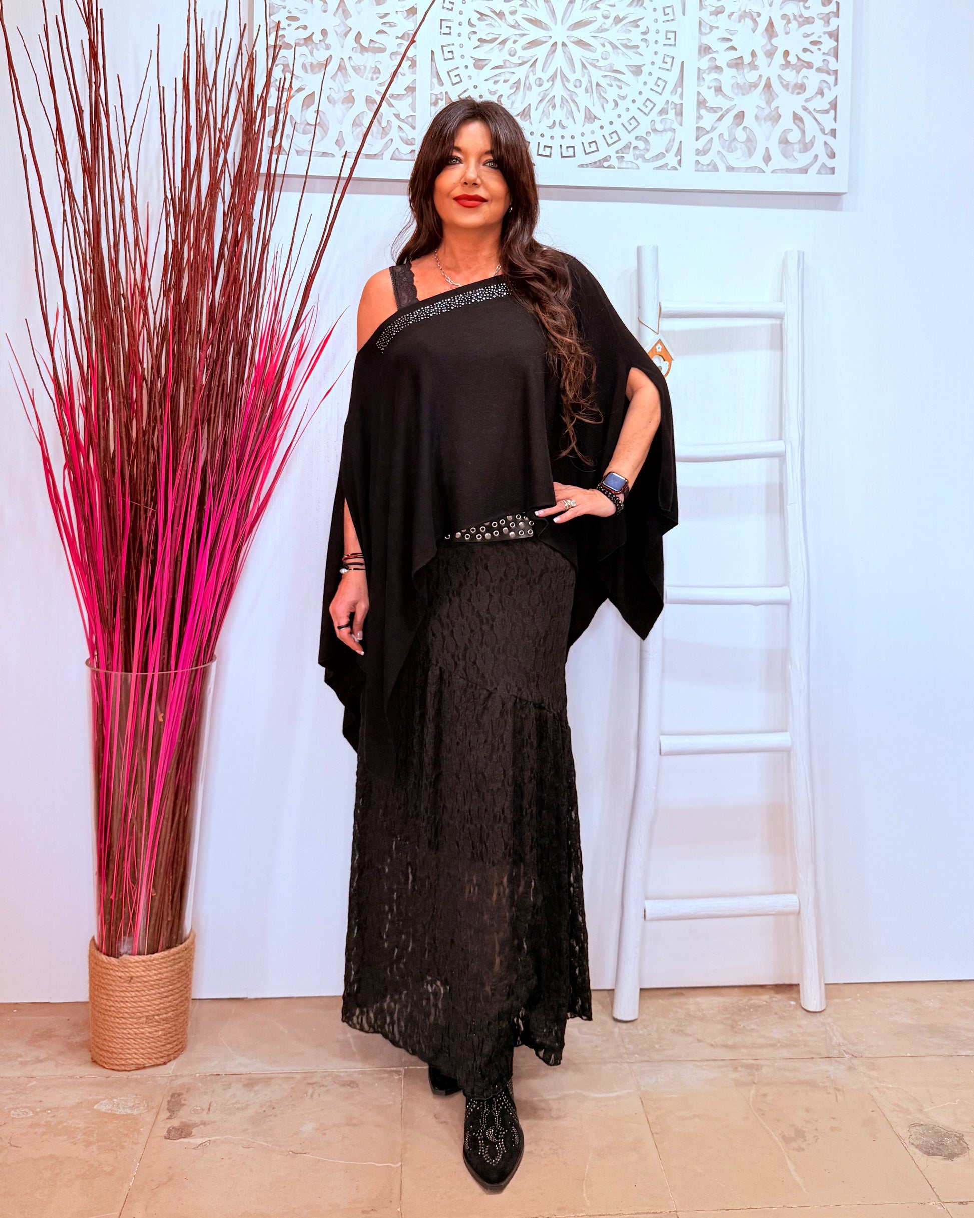 Maglione Poncho Emiko, collo a barchetta, dettagli brillanti sul collo.