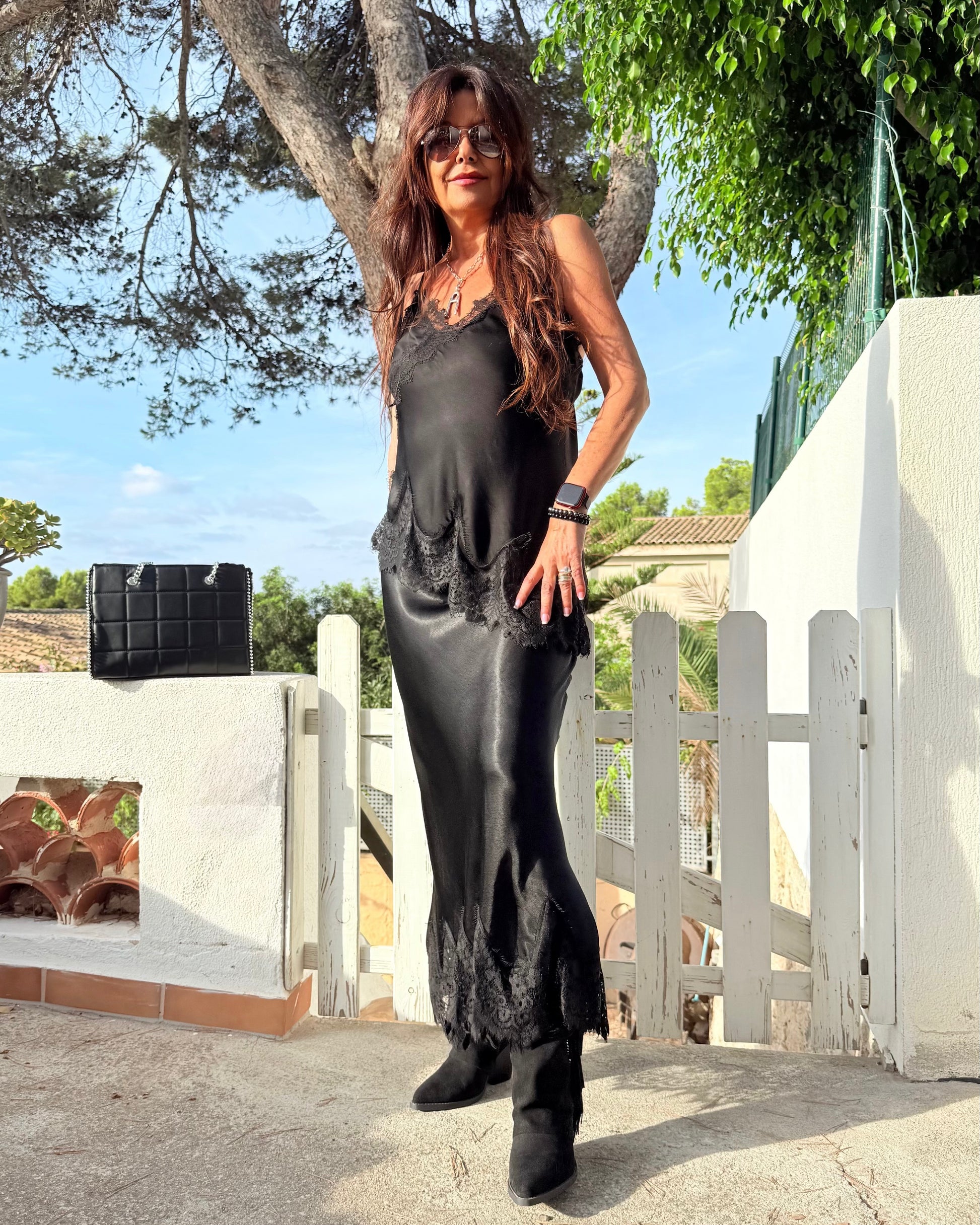 Lencero Tendence de viscosa con blonda en el escote cruzado y el bajo, elástico en la espalda, tirantes regulables, bajo asimétrico, efecto desgastado.