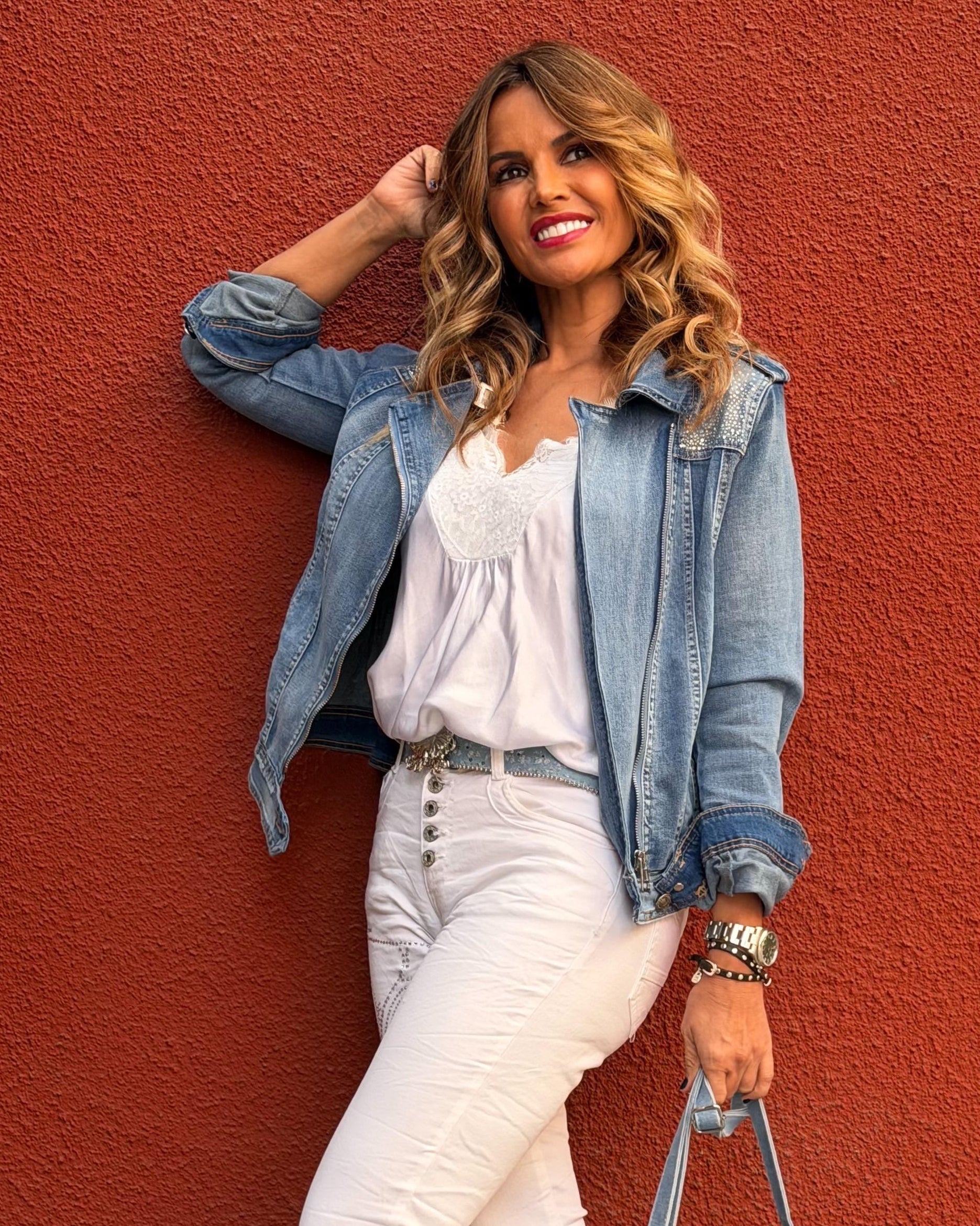 Blusa Lencera Talía con blonda en el escote y manga, tela satinada con caída. Lisa por detrás.