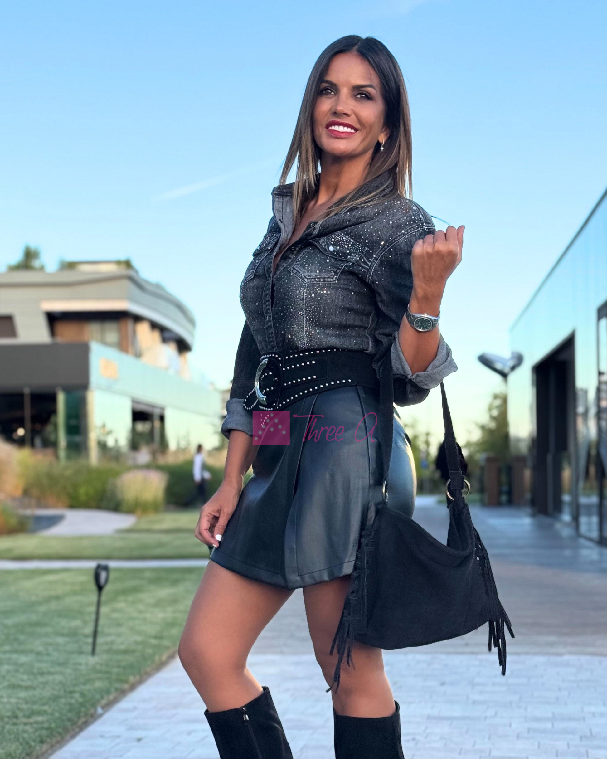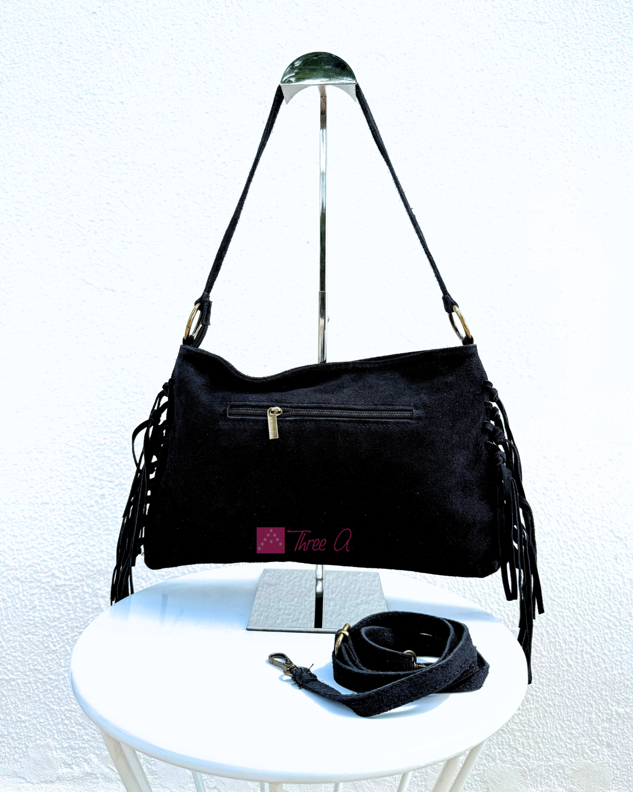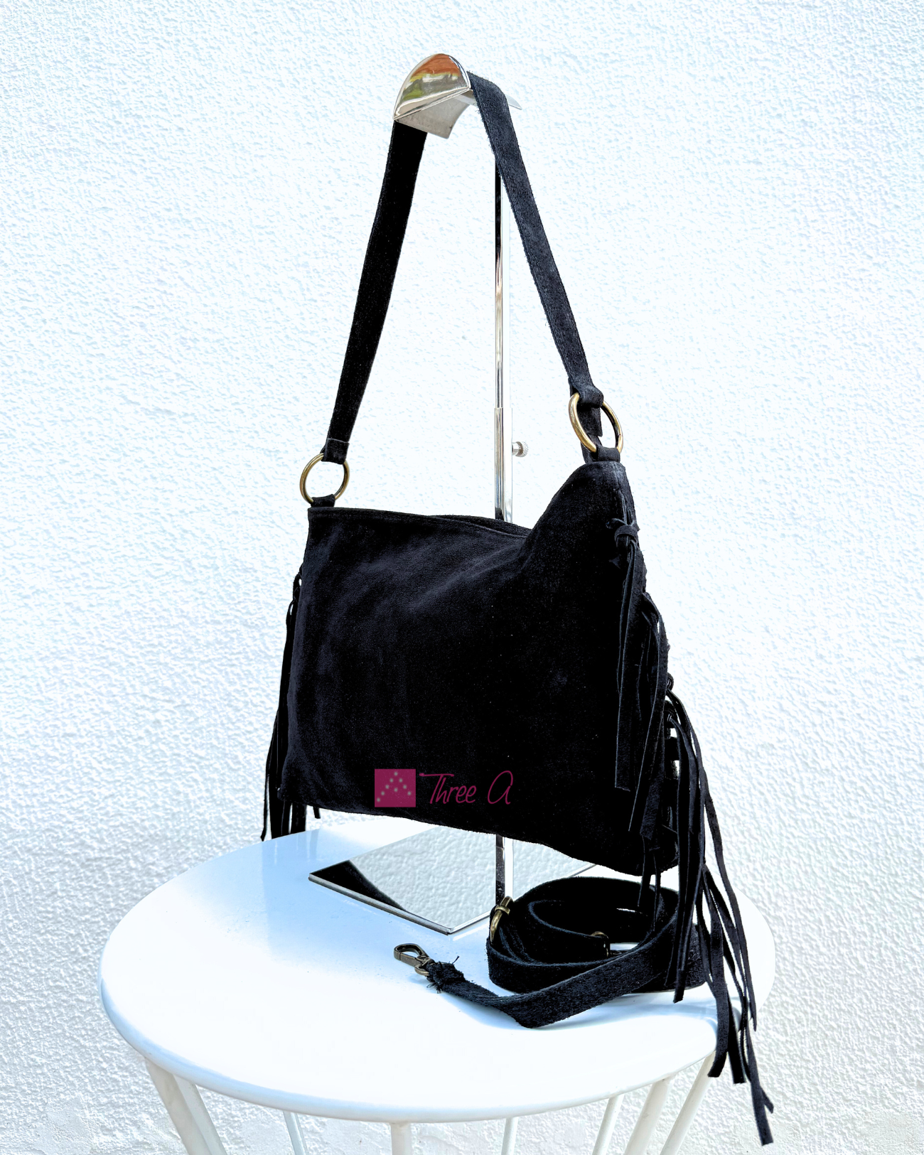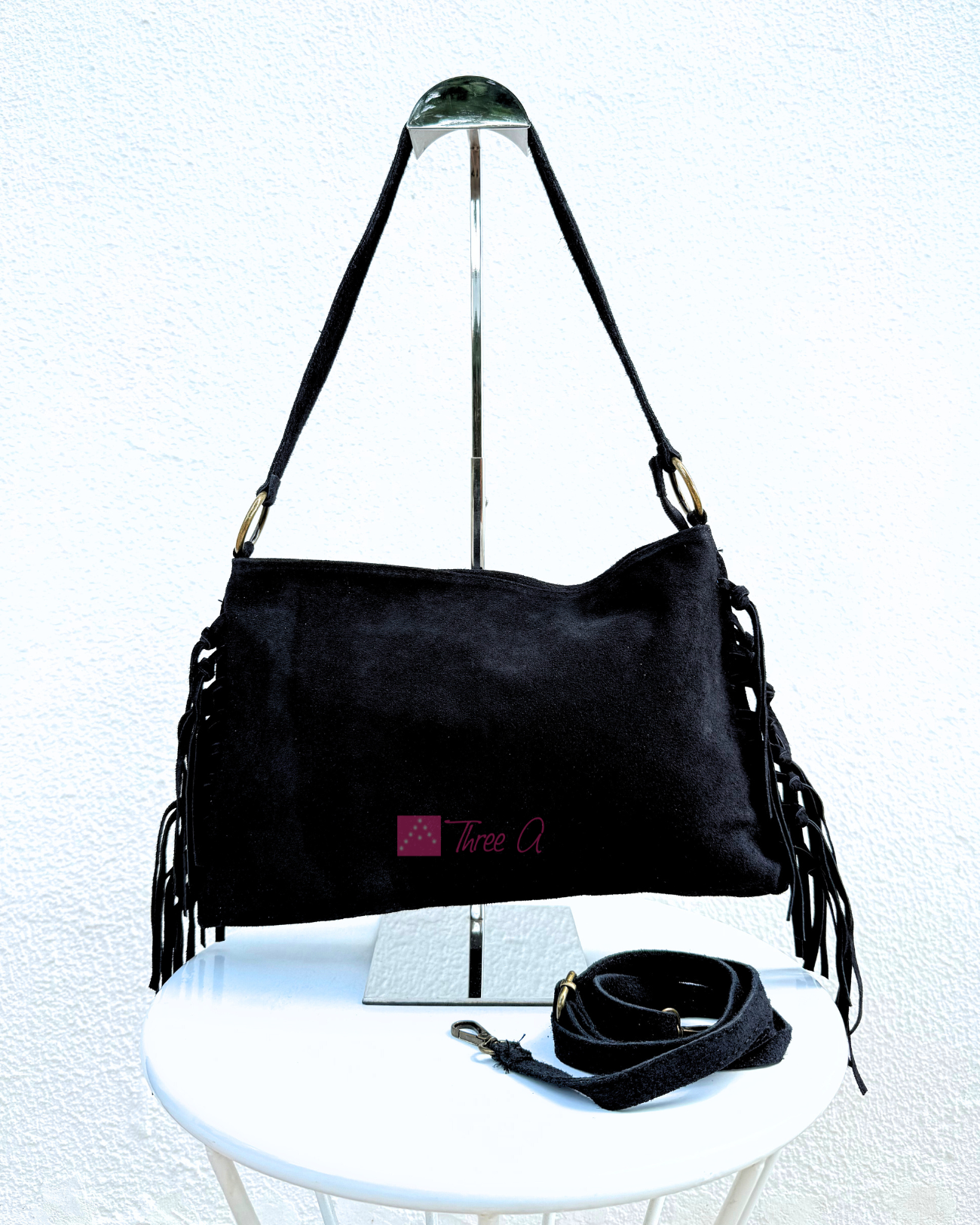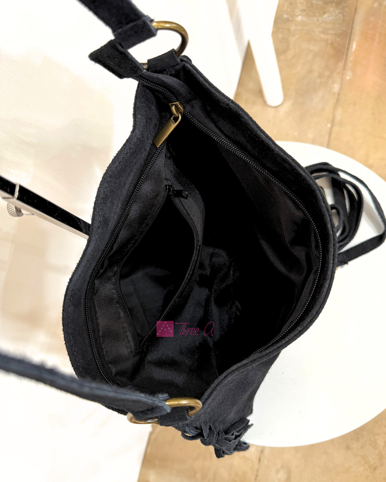 Bolso de Ante con flecos en los laterales, interiormente forrado, 1 bolsillo con cremallera. Cierra con cremallera. Asa para llevar al hombro y asa regulable