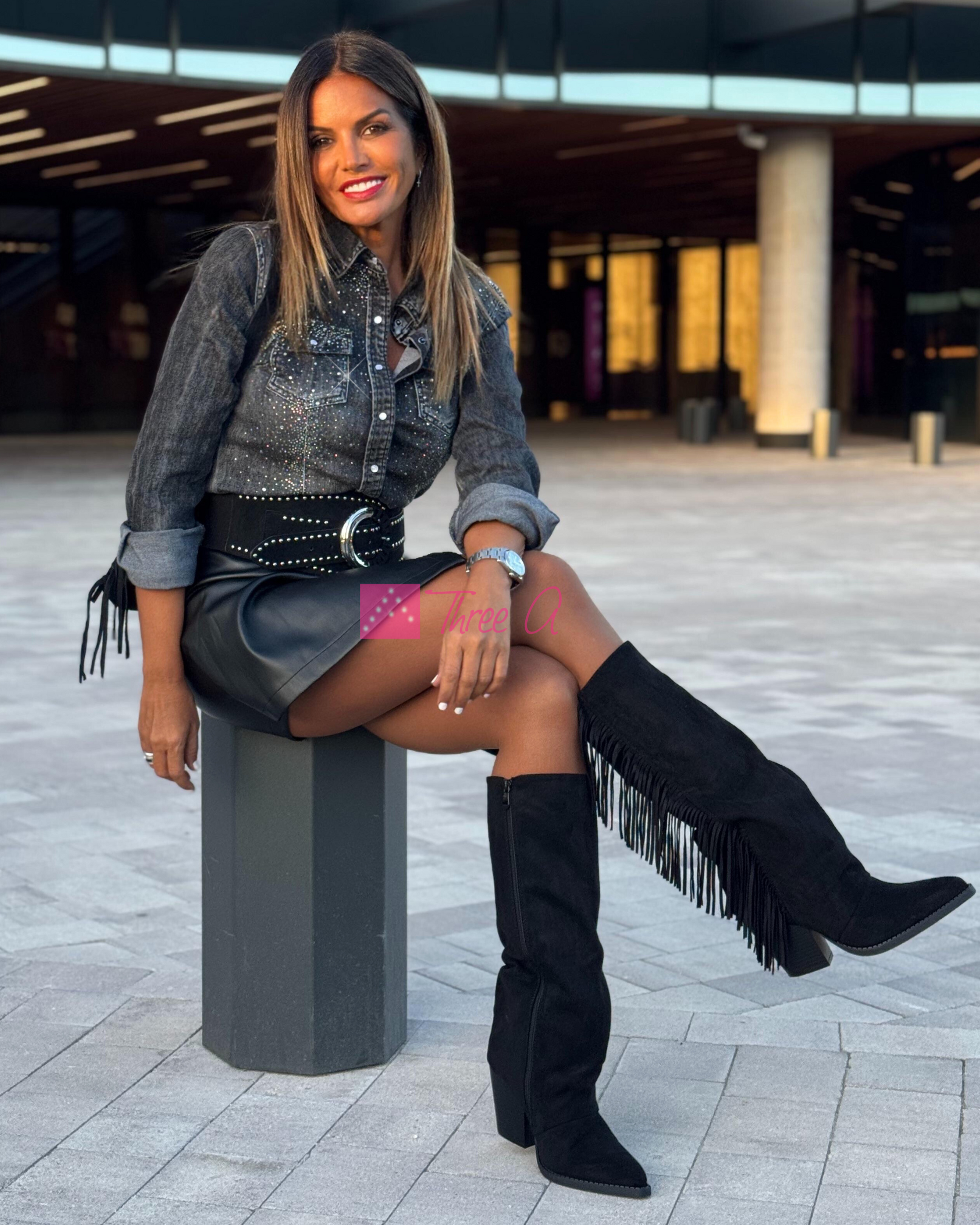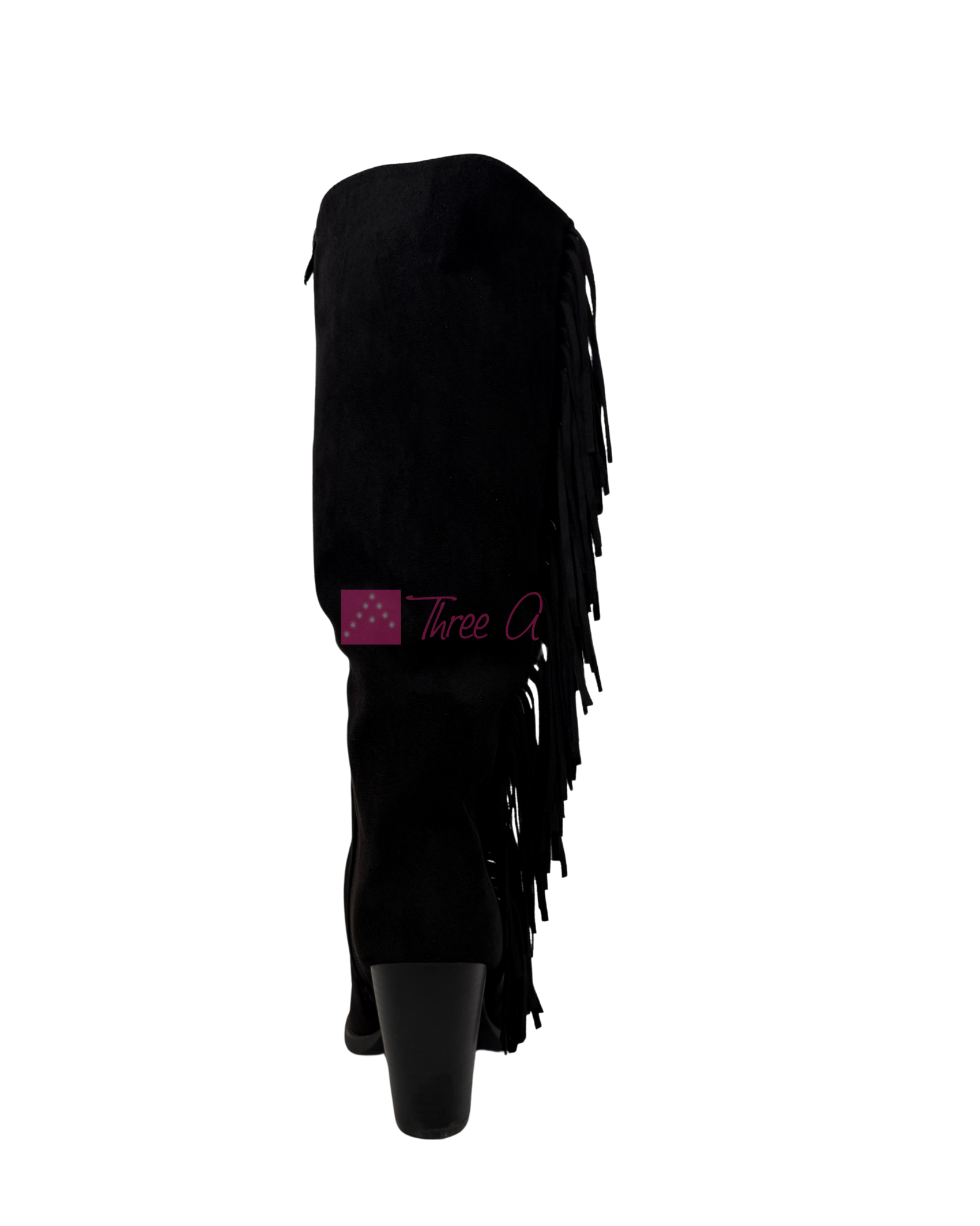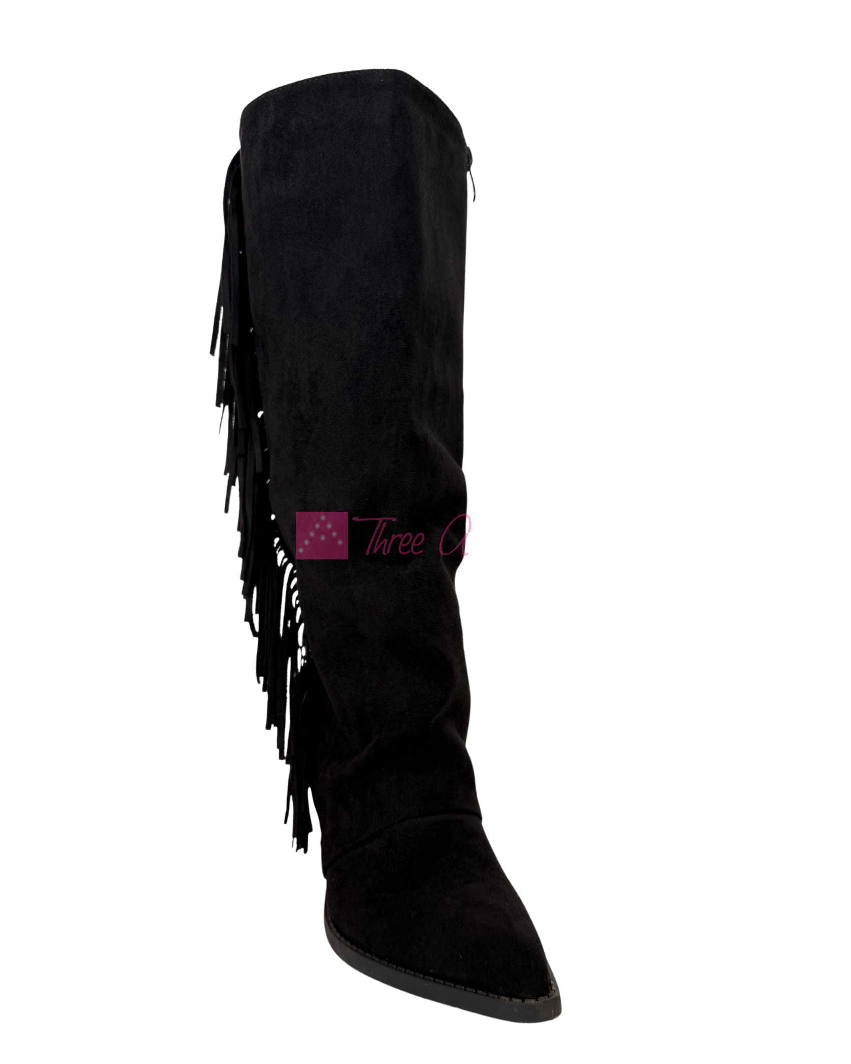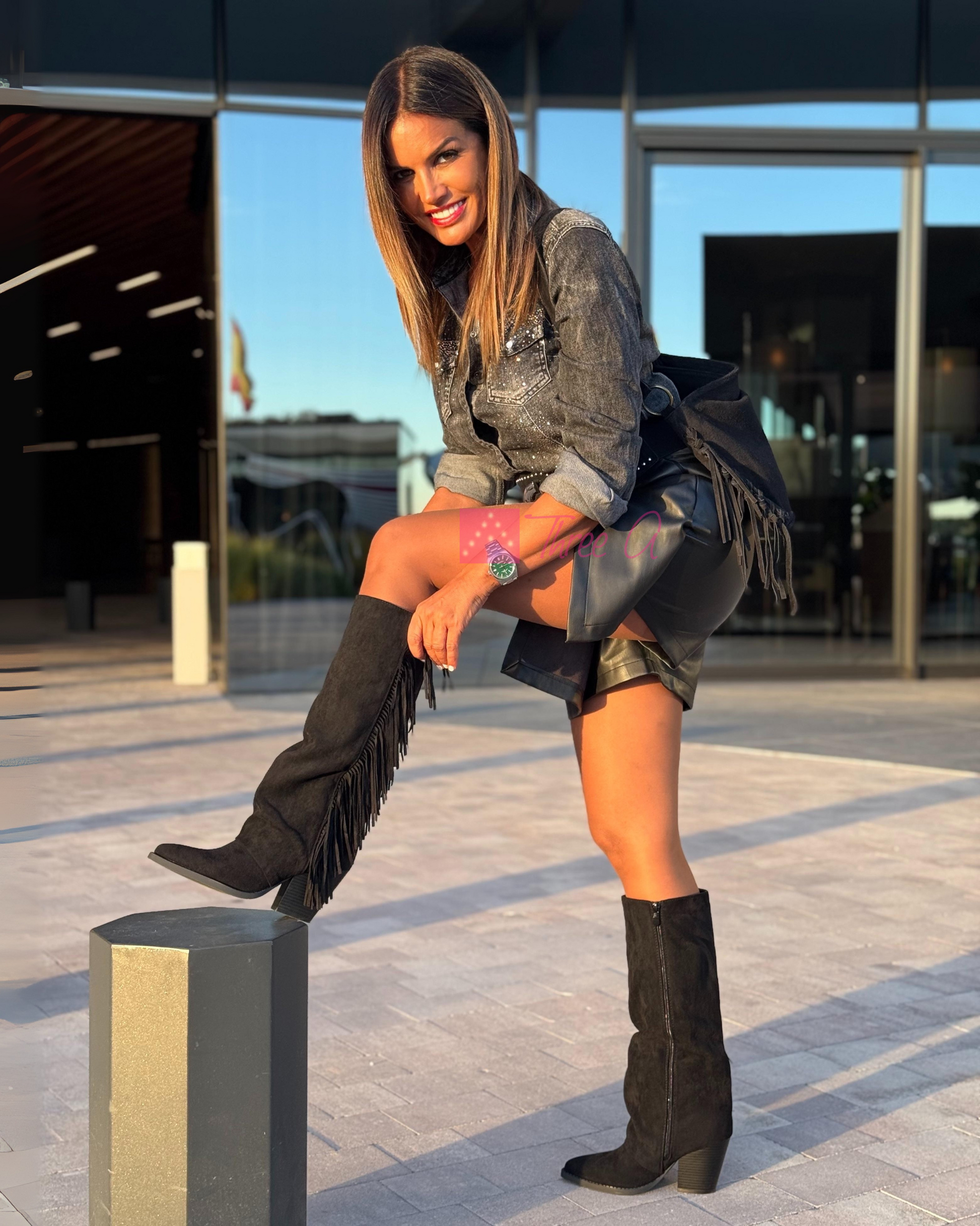 COMODÍSIMA Bota Siena de Antelina decorada con flecos en el lateral, tacón de 7cm y caña de 38cm. Cierra con cremallera. Forrada interiormente. Calzan normal.