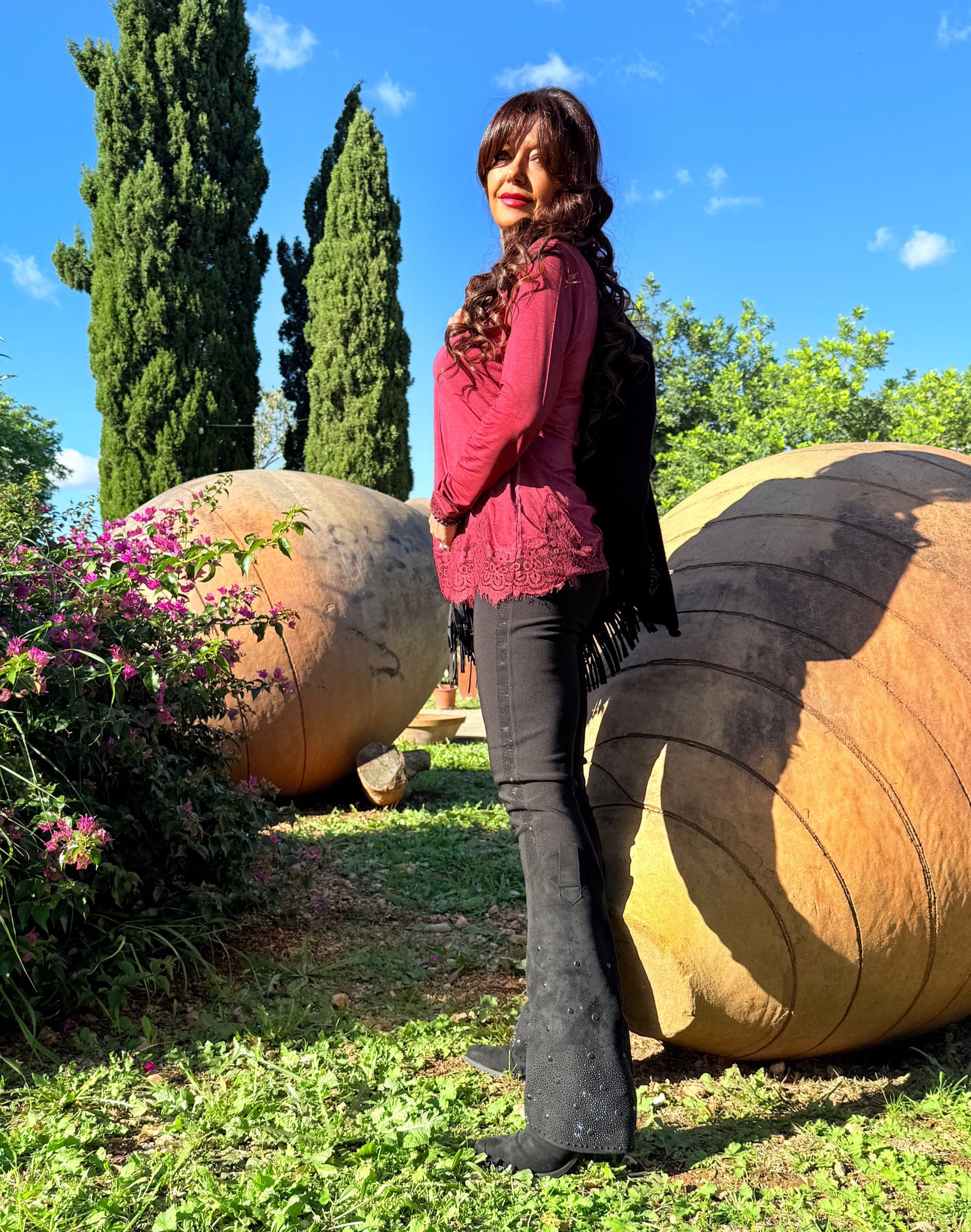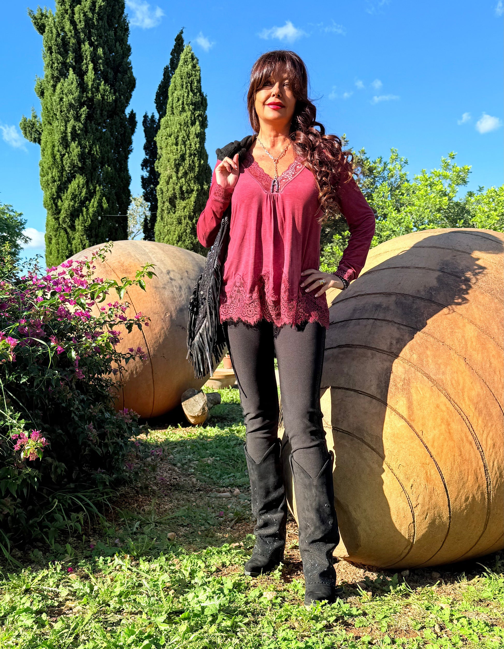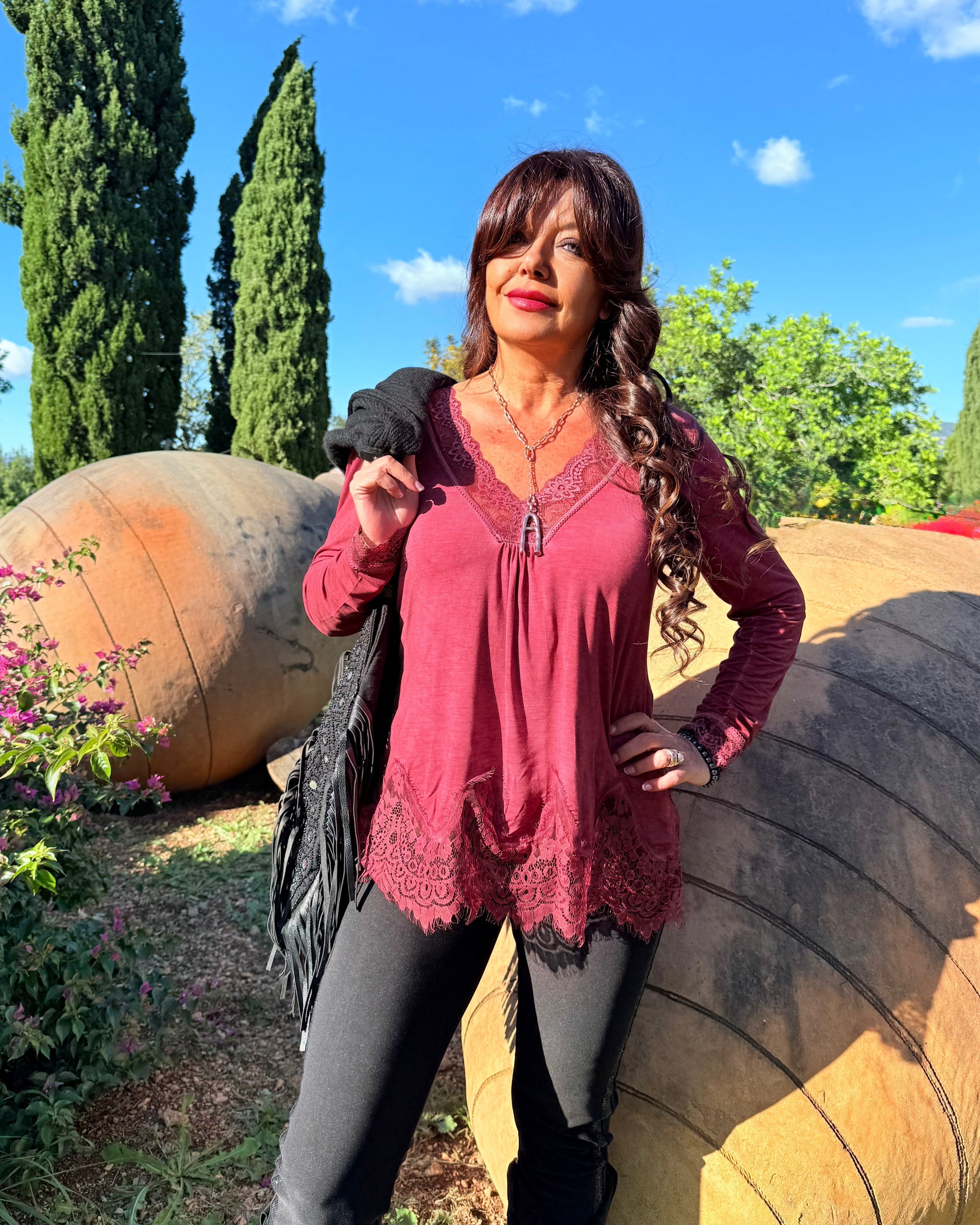 Camiseta escote pico con blonda en escote, bajo y puños. Manga larga