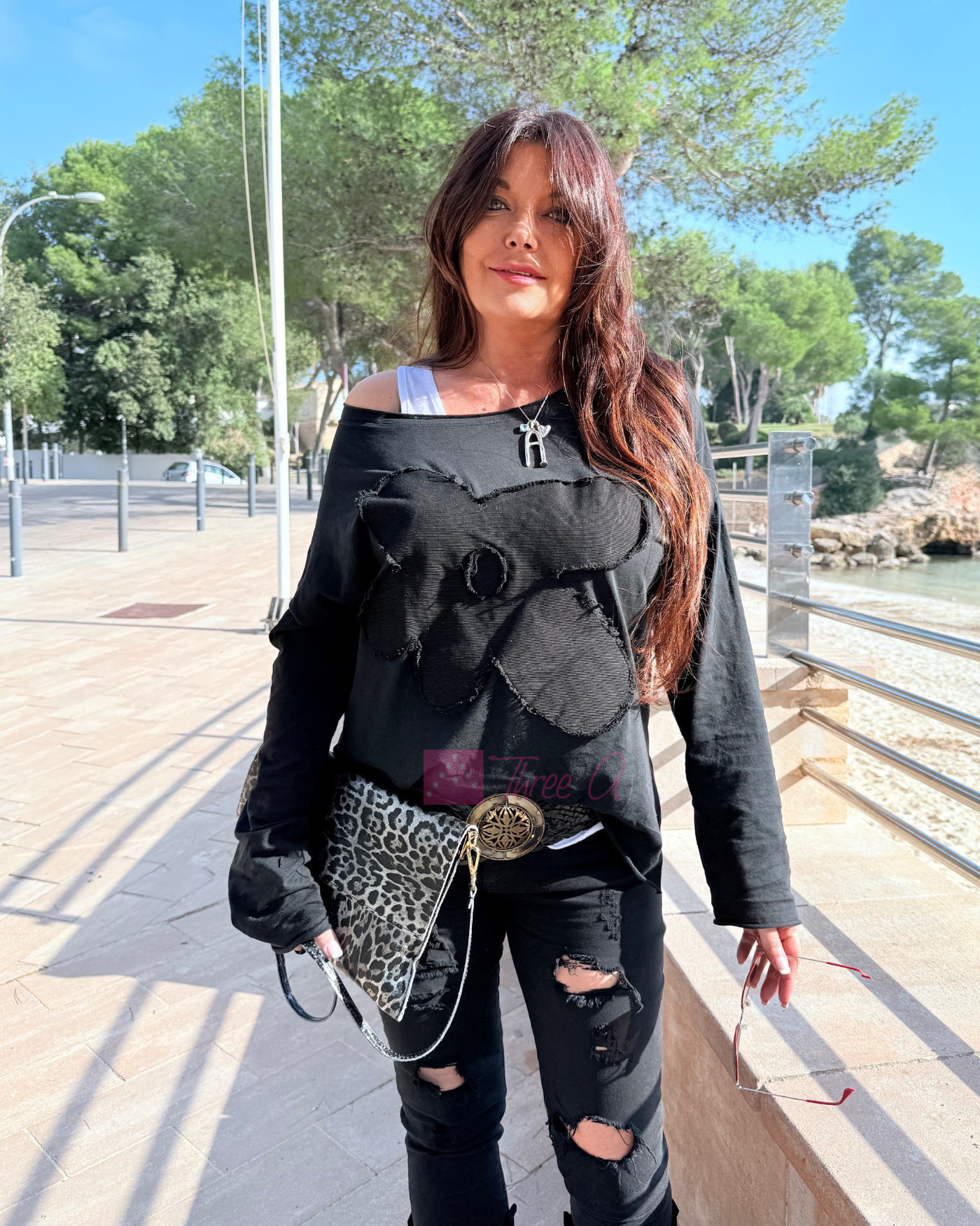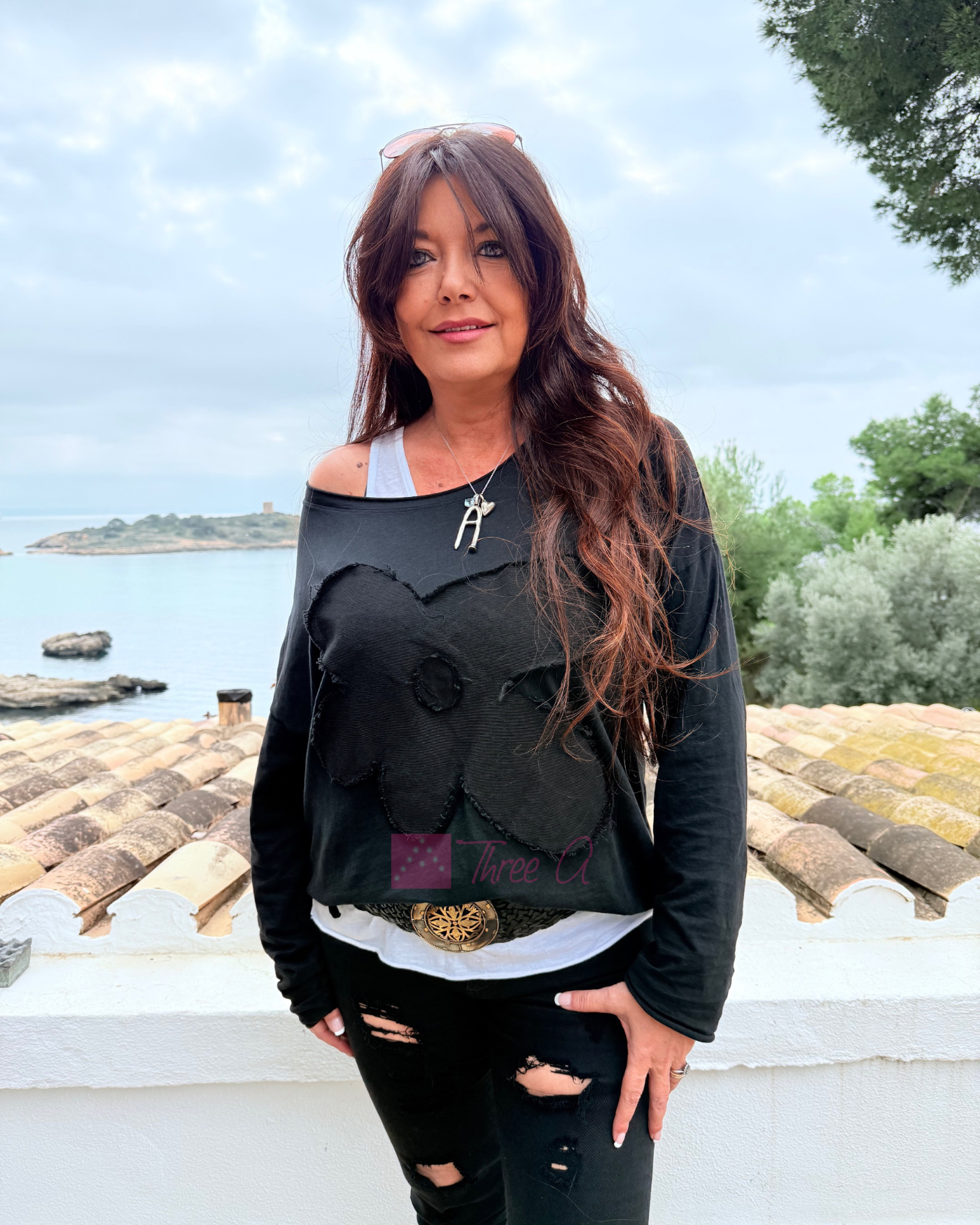Camiseta Lixy con detalle frontal, aberturas laterales, cuello amplio.