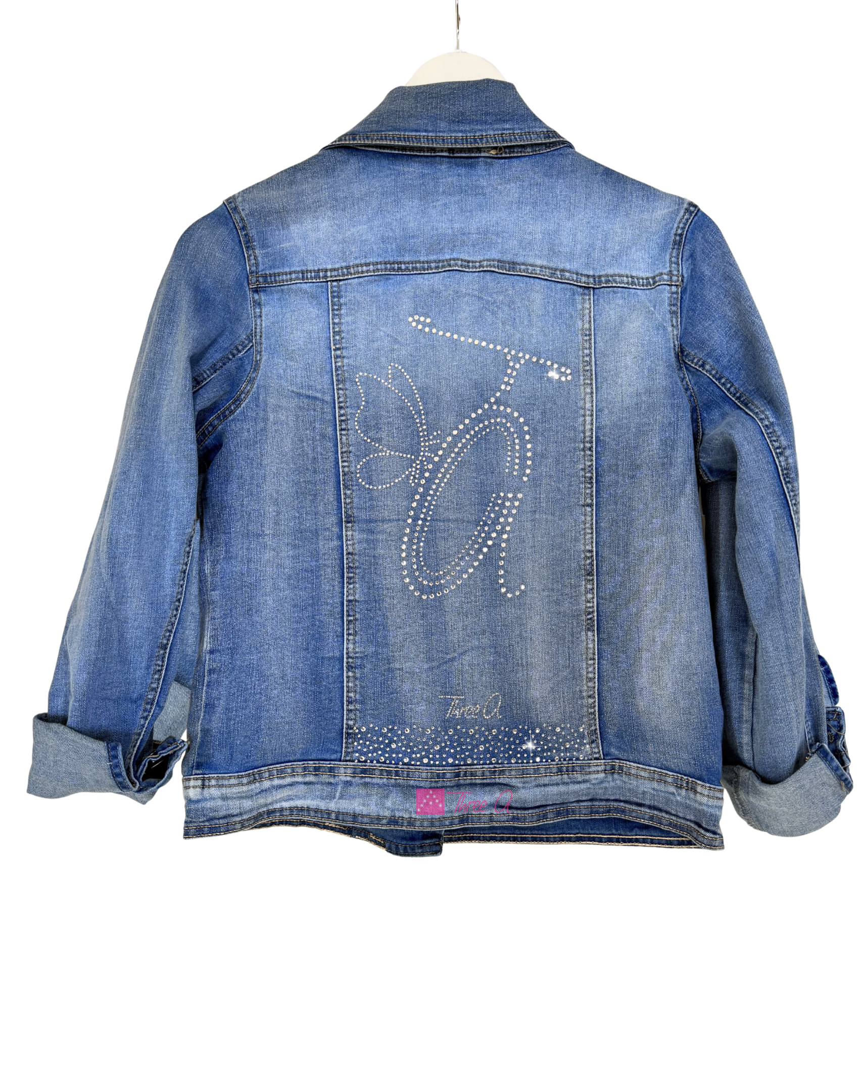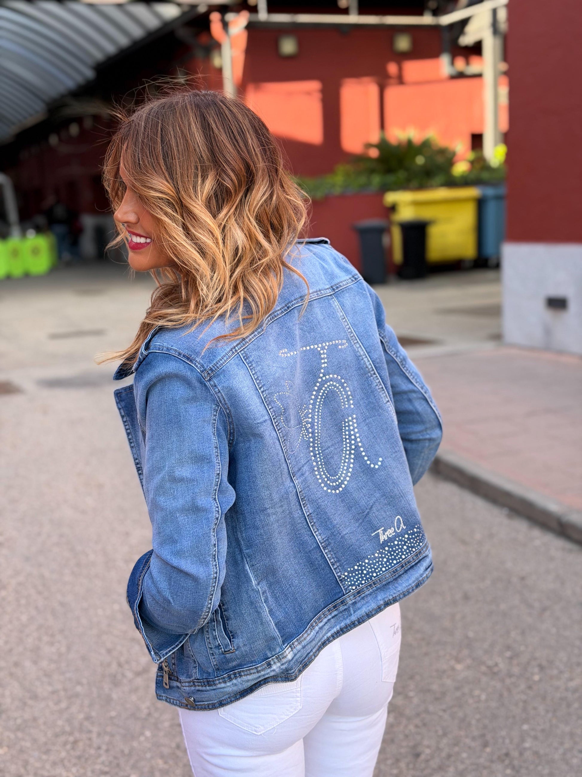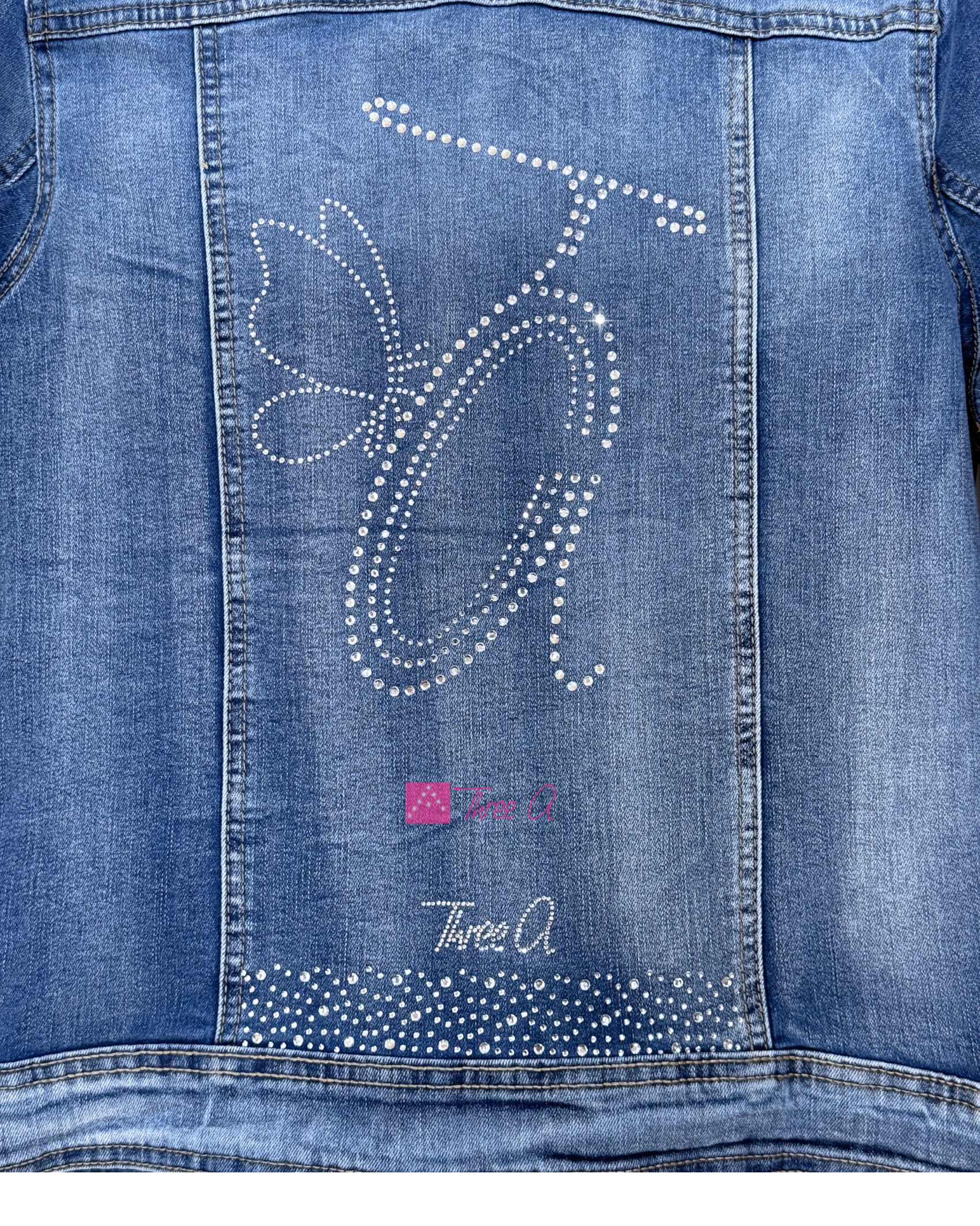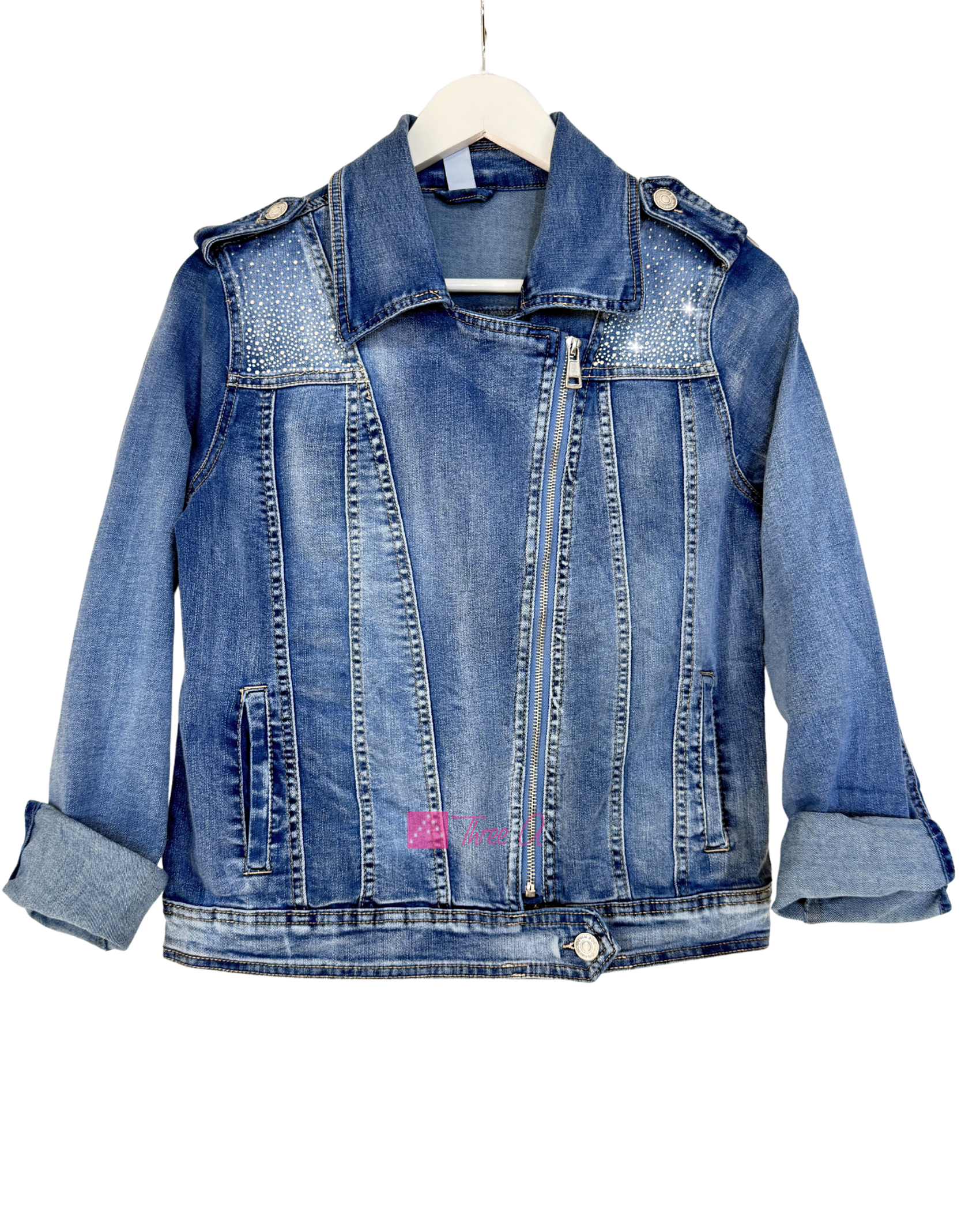 EXCLUSIVA Three A® Cazadora Vaquera Princess estilo Biker con Strass en la parte frontal y espalda. Elástica. No hay otra igual! Detalle de nuestros diseños exclusivos con Strass.