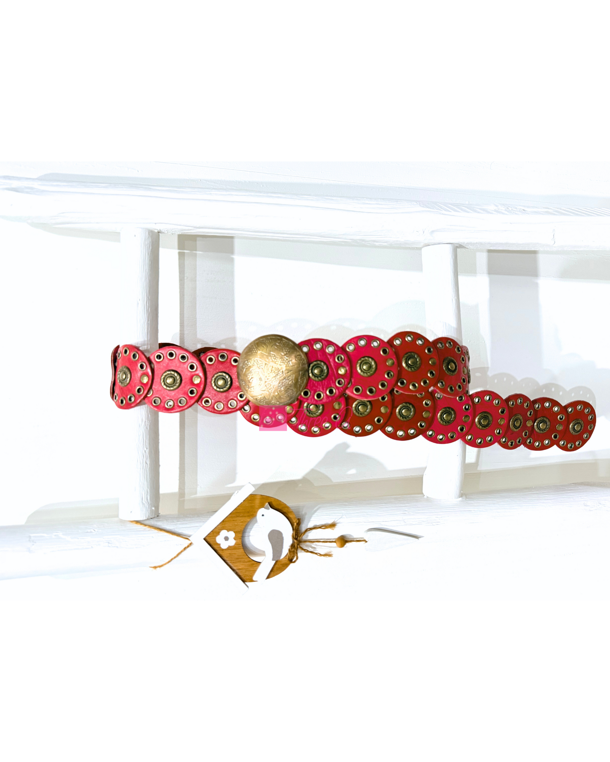 Cinturón de cuero artesanal con remaches decorativos en dorado envejecido. La hebilla lleva un sistema de enganche como cierre, que puedes colocar en cualquier punto del cinturón, para poder regular a tu gusto.