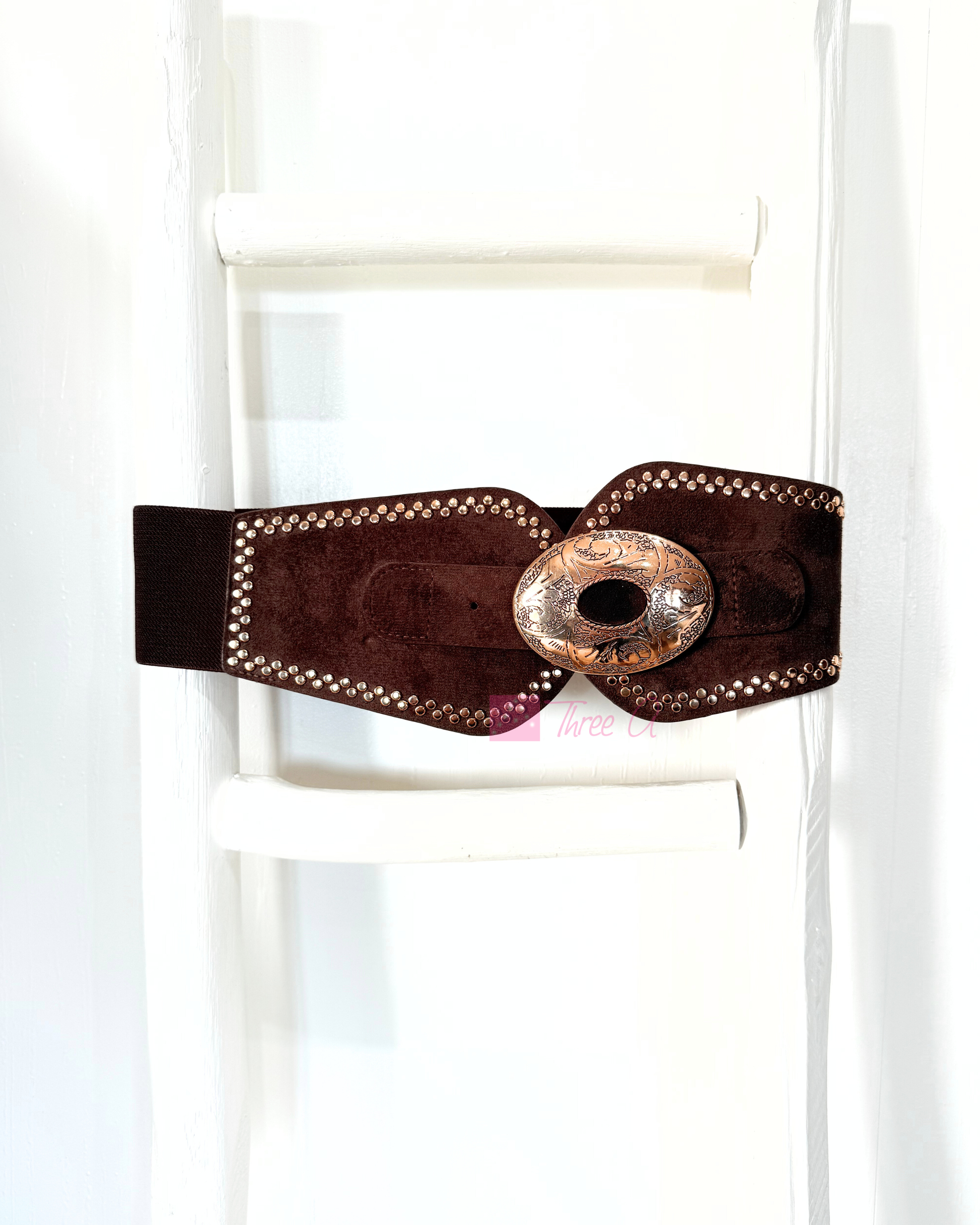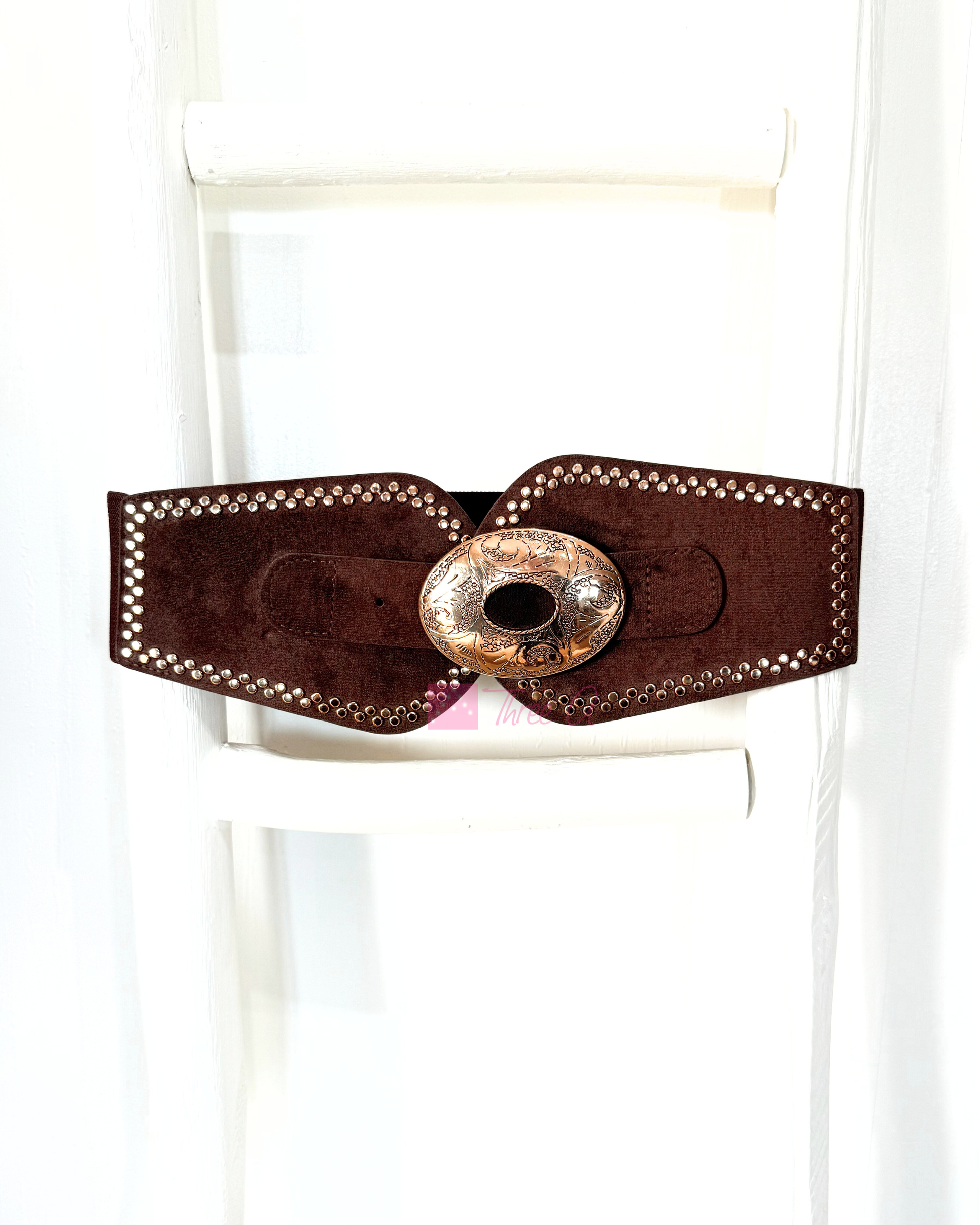 Cinturón de Antelina Janet con tachuelas en dorado y pieza central, ajustable a la cintura, lleva goma en la parte trasera.