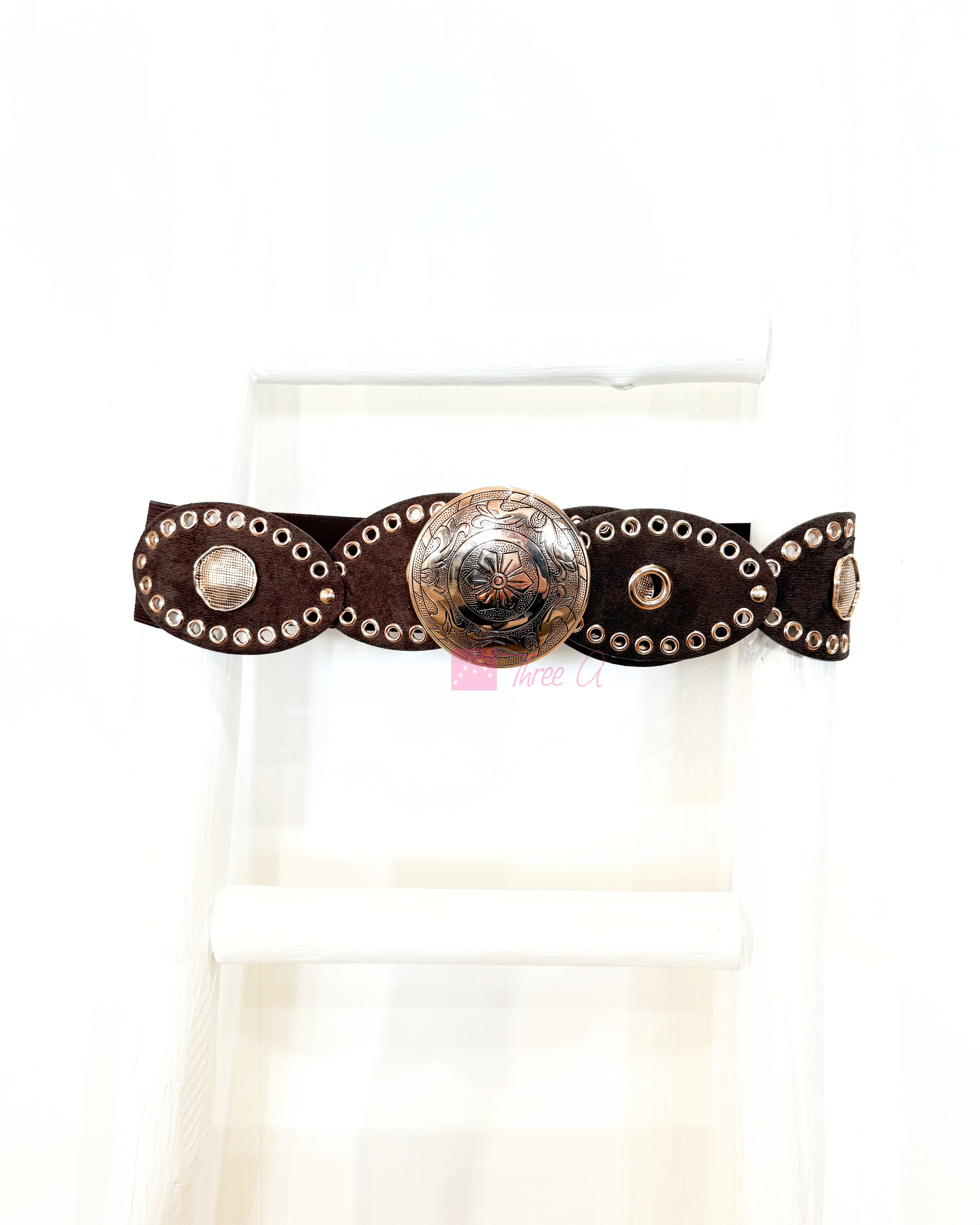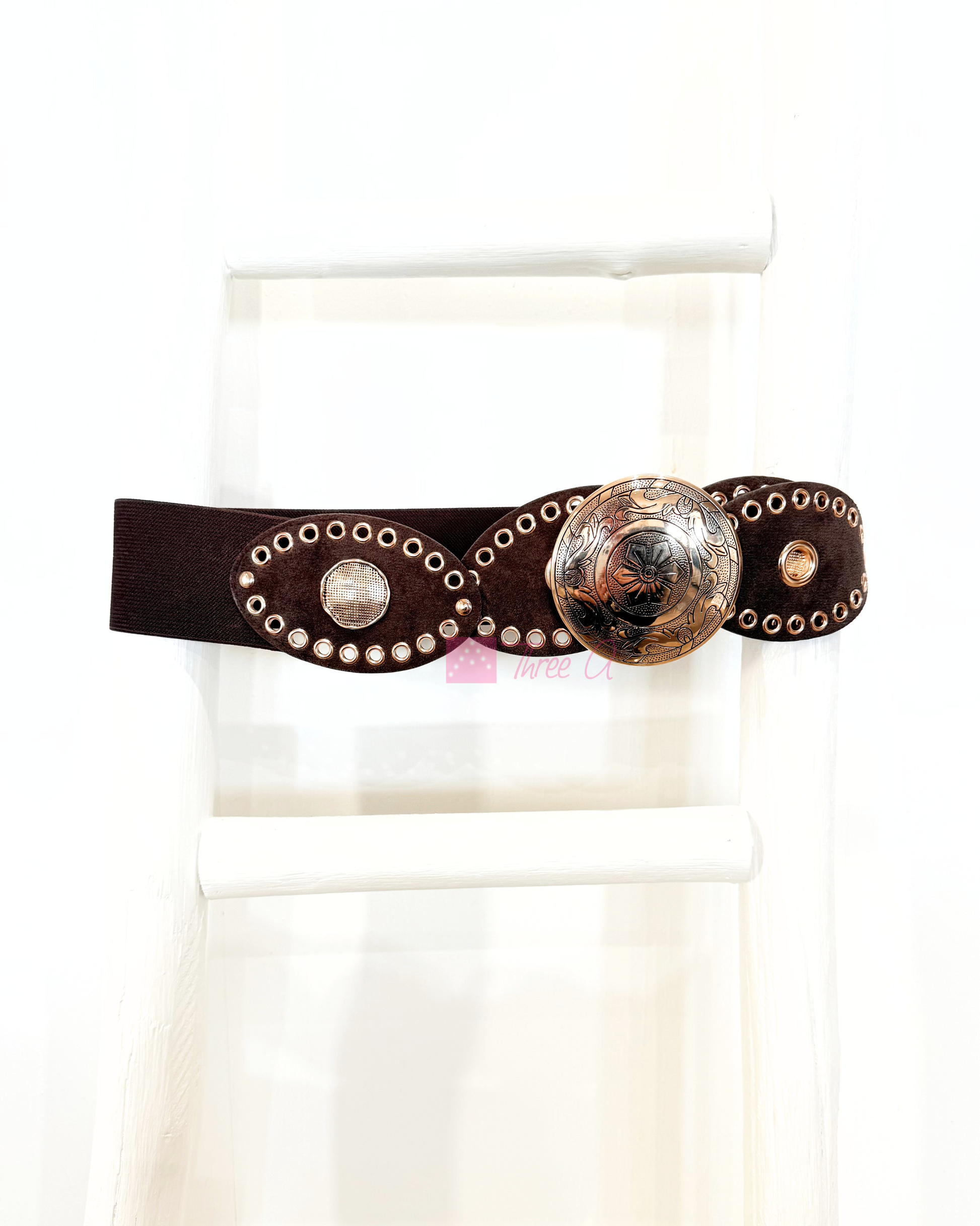Cinturón de Antelina Pinky con detalles en dorado, ajustable a la cintura, lleva goma en la parte trasera.