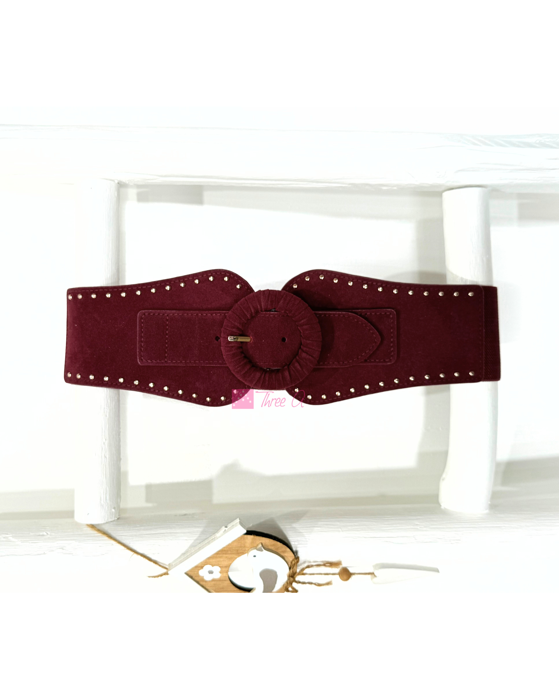Cinturón de Antelina Ysa con tachuelas en dorado, ajustable a la cintura, lleva goma en la parte trasera.