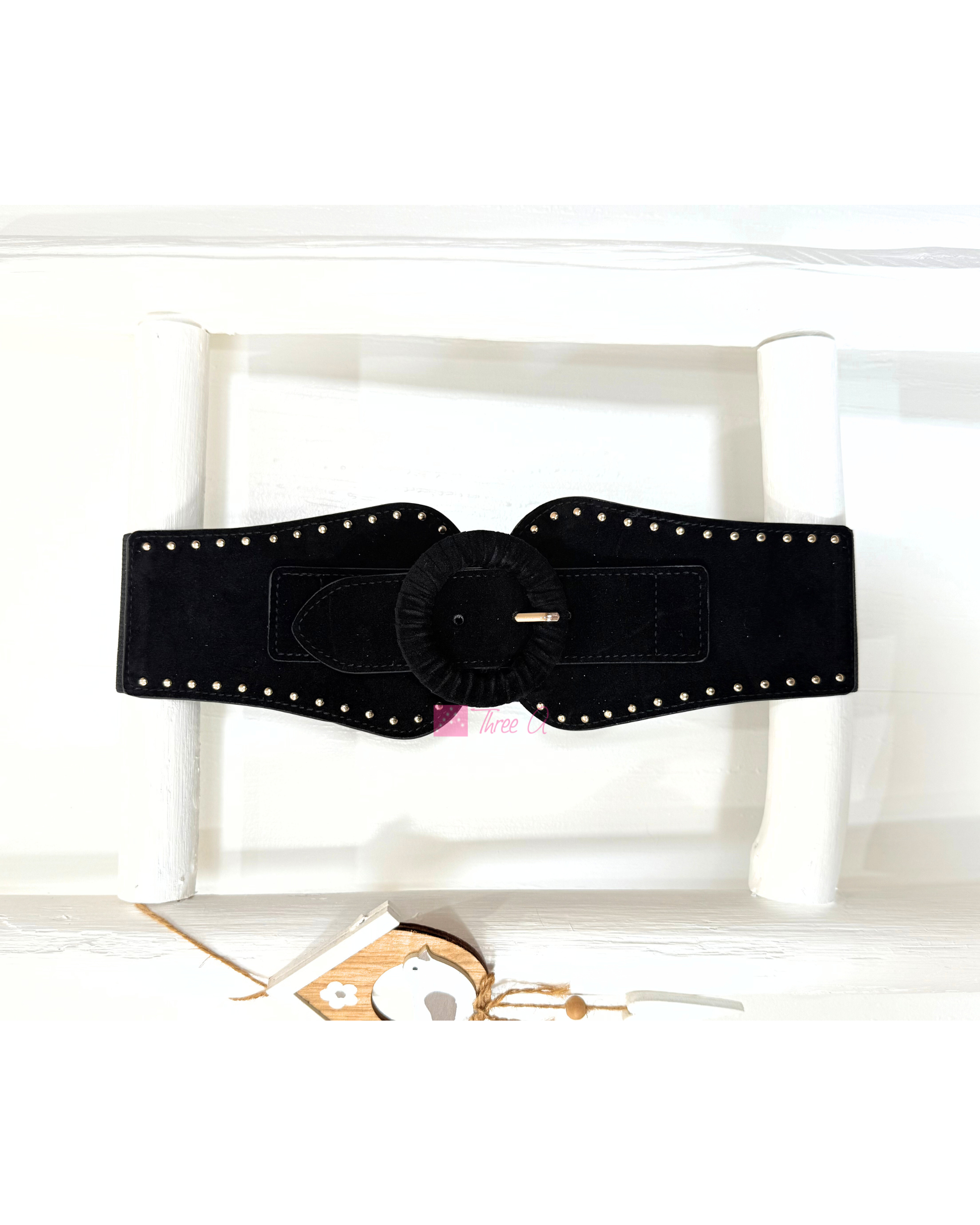 Cinturón de Antelina Ysa con tachuelas en dorado, ajustable a la cintura, lleva goma en la parte trasera.