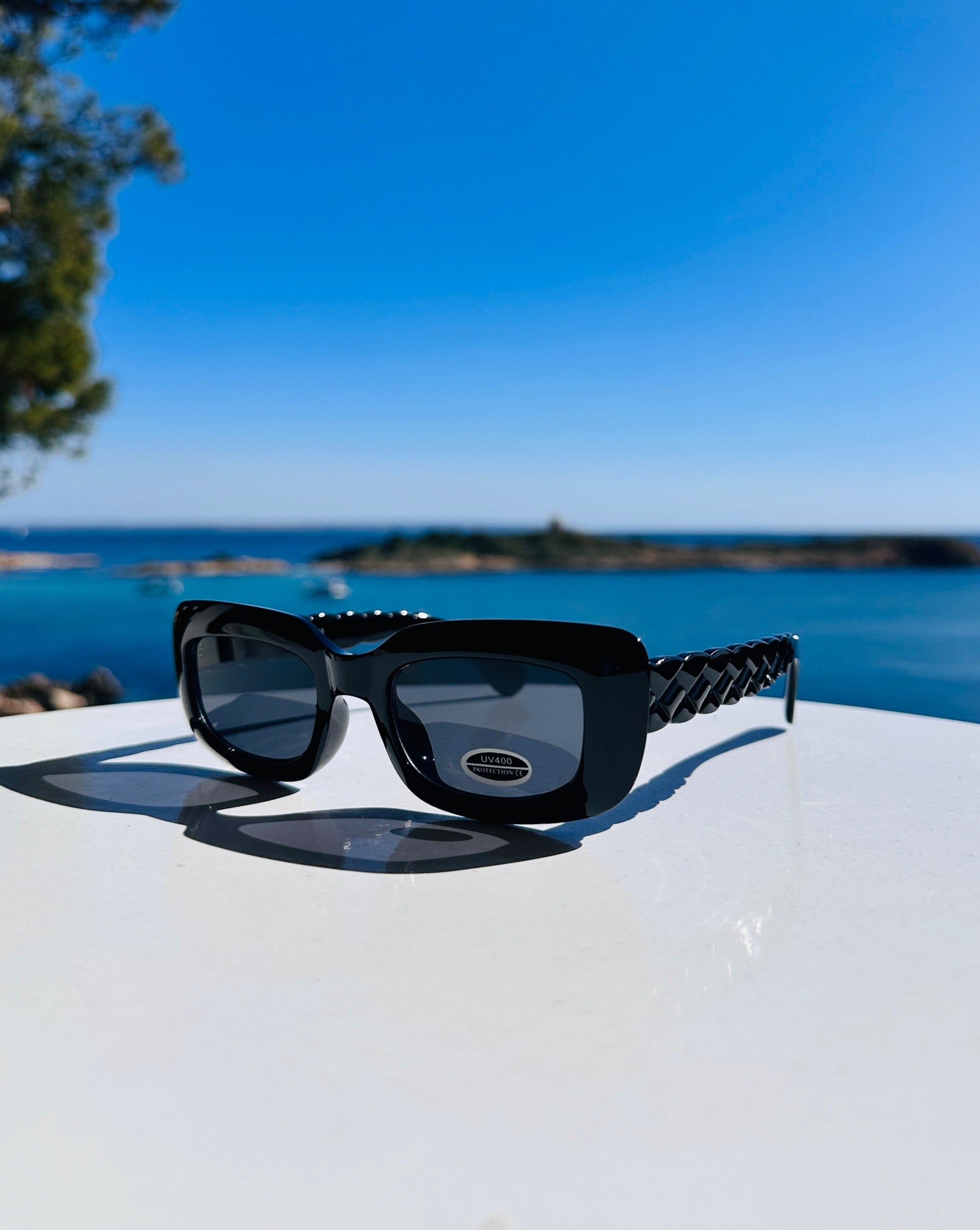 Gagas con montura de pasta negra, patillas trenzada y cristal negro, con UV400 de protección