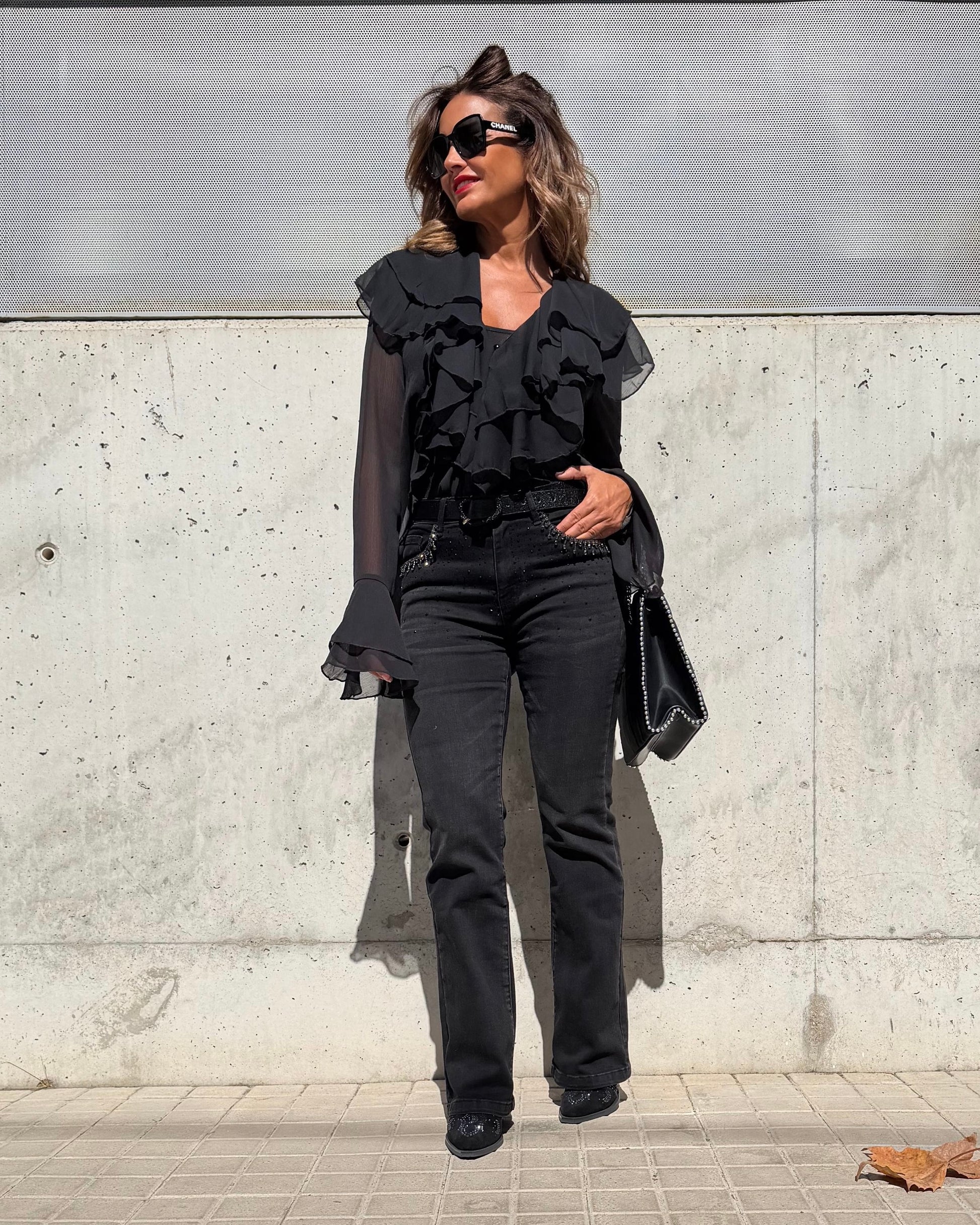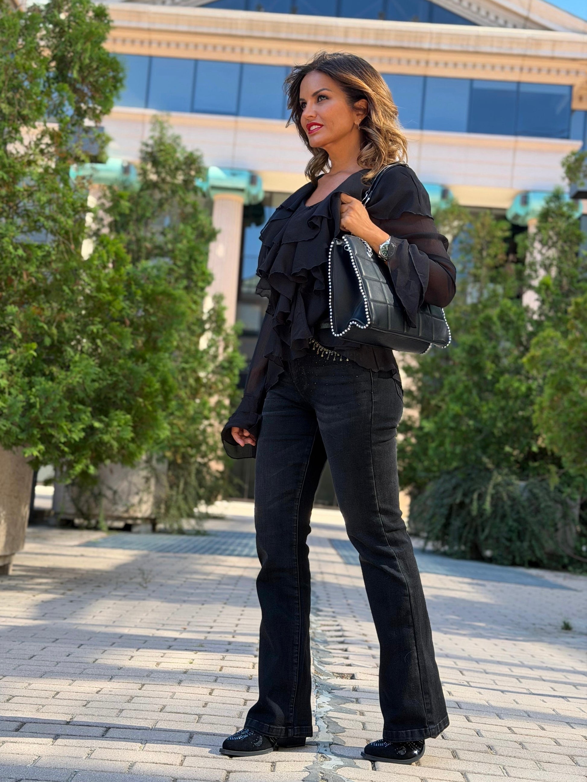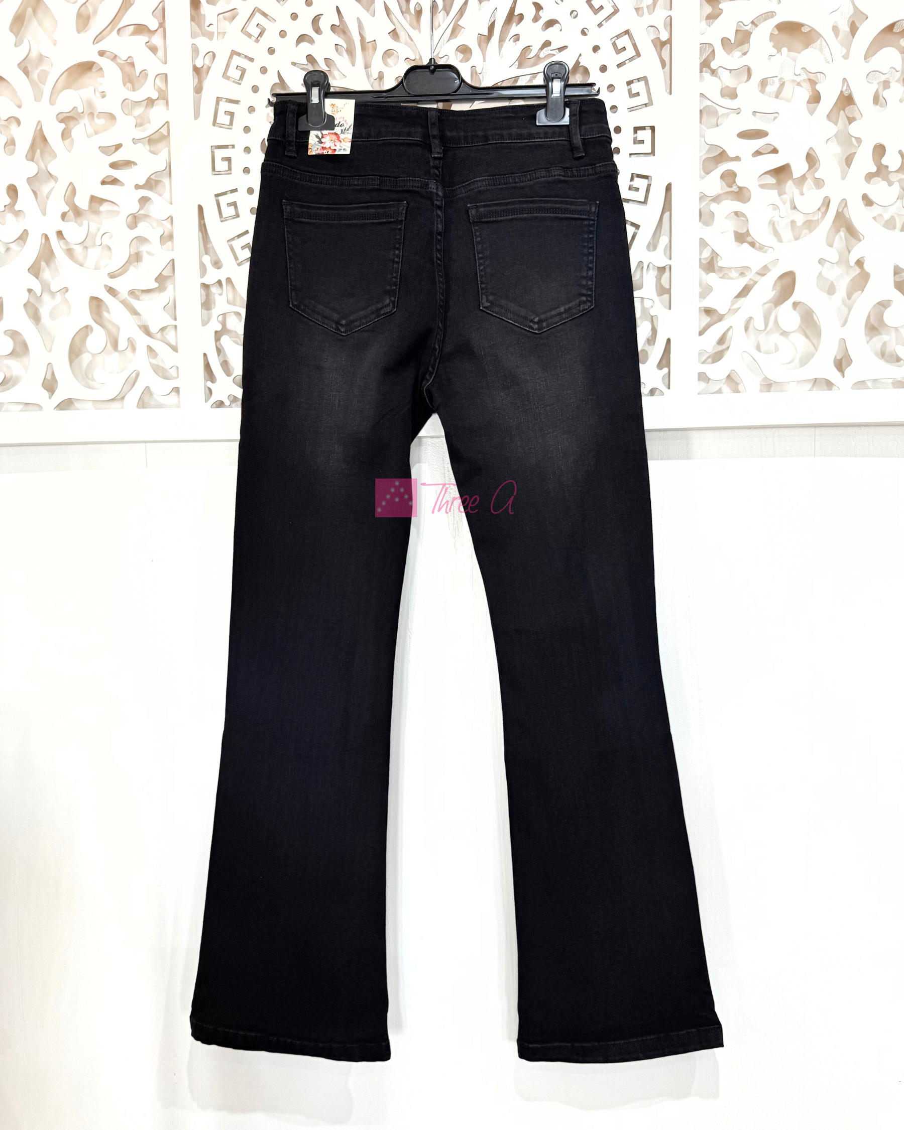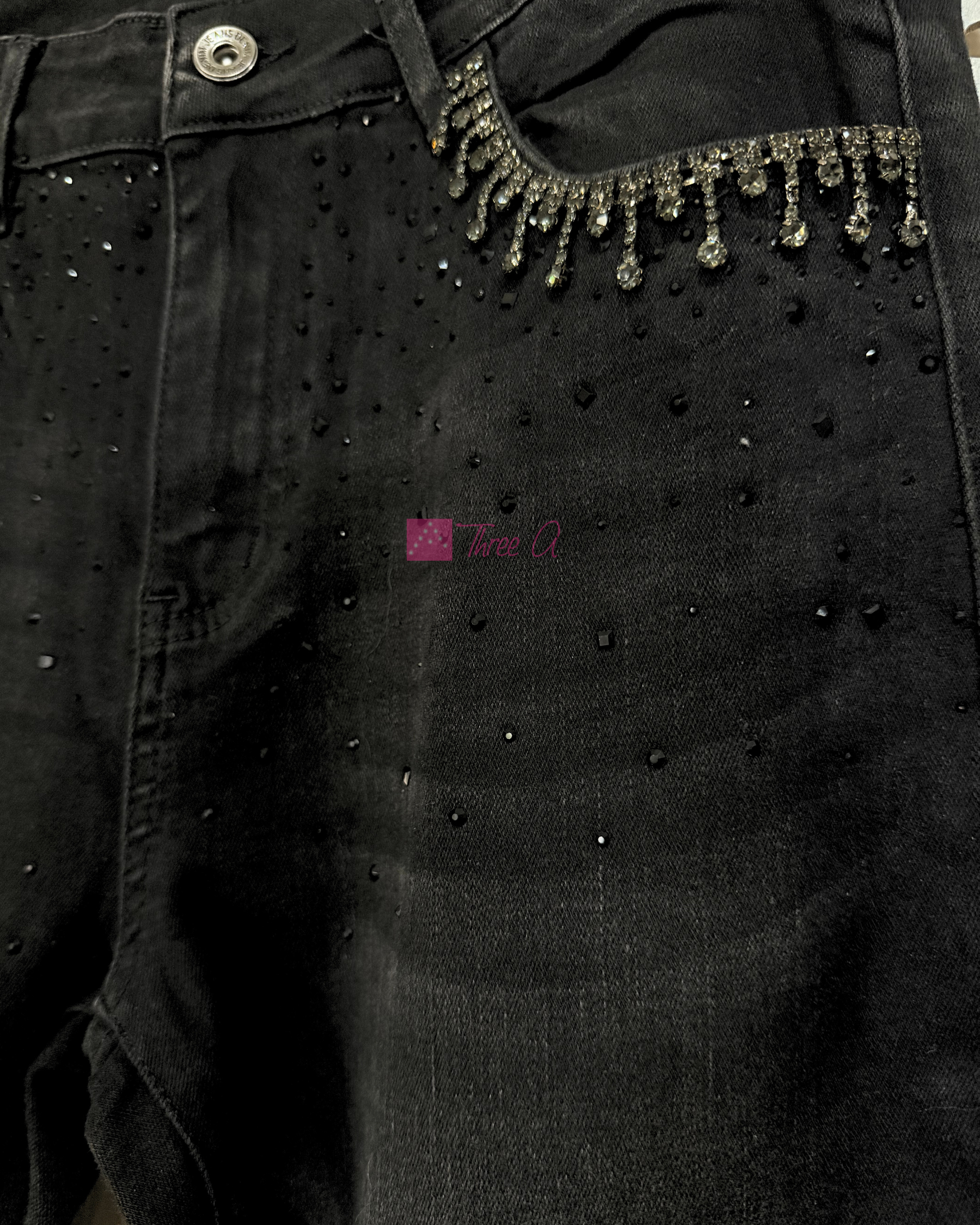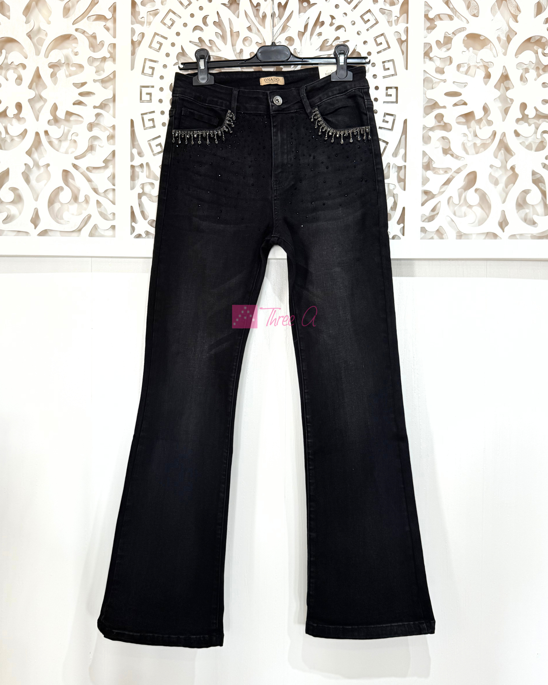 Jean Brill con detalle en los bolsillo con brillantes y strass negro, recto acampanado en el bajo, bastante elásticos, tiro medio/alto, cierra con cremallera.