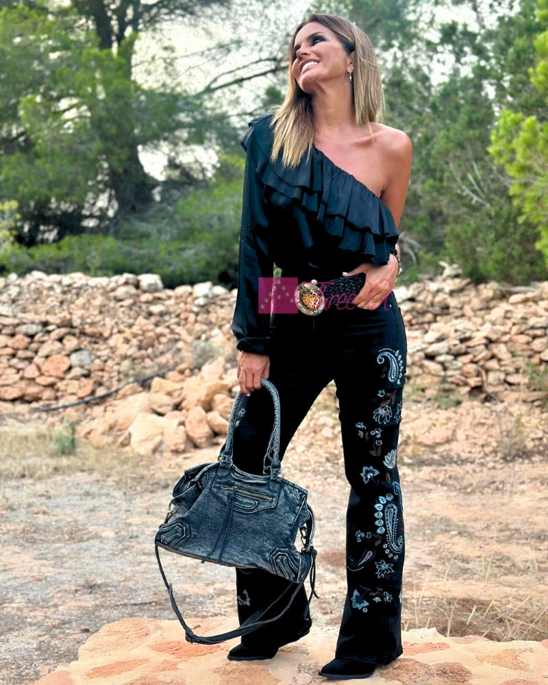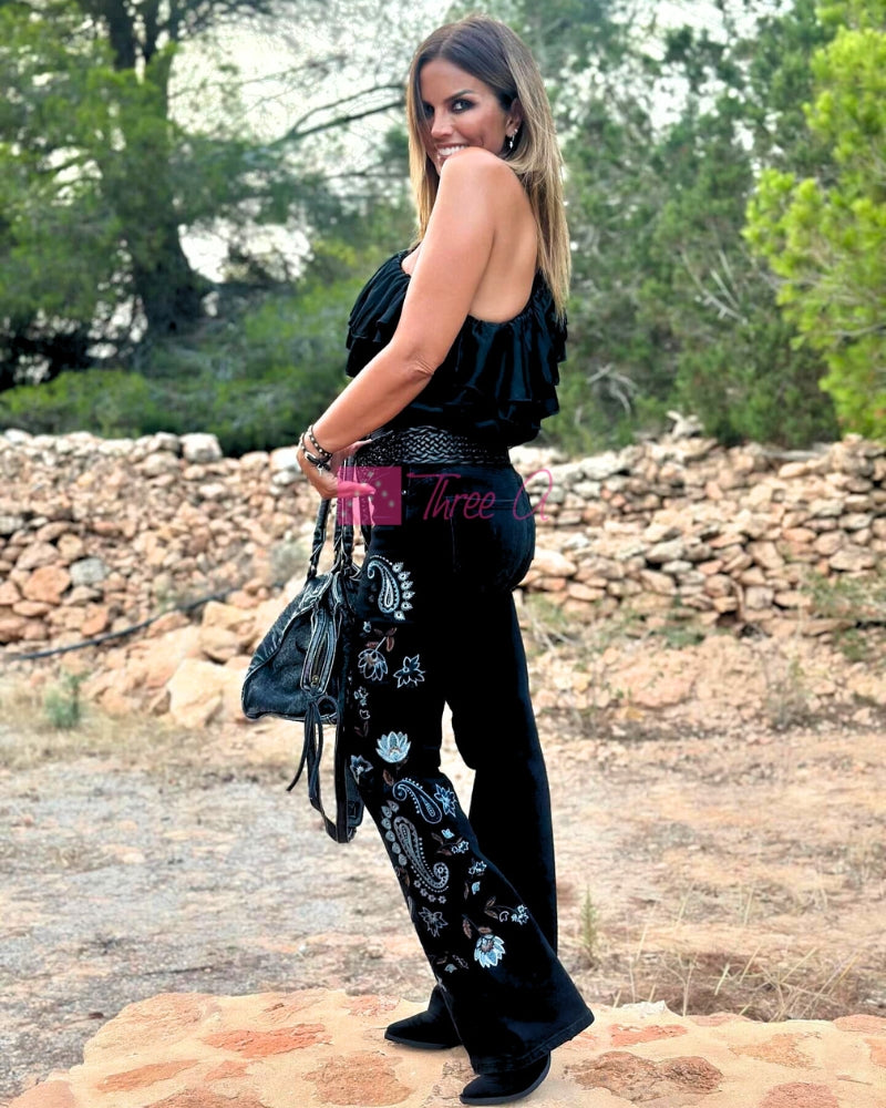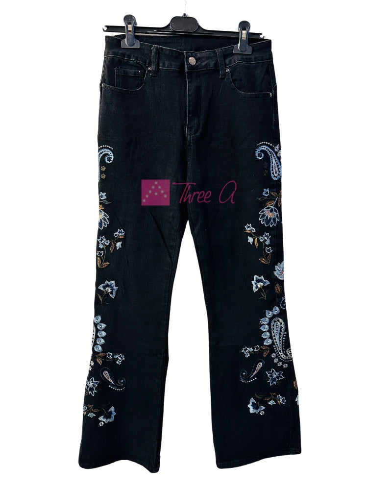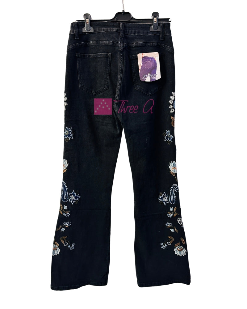 Espectacular Jean Malya efecto Push-Up acampanado en el bajo con bordados en los laterales, elástico, tiro medio, cierra con cremallera, 2 bolsillos delante y 2 detrás. Tallan normal.