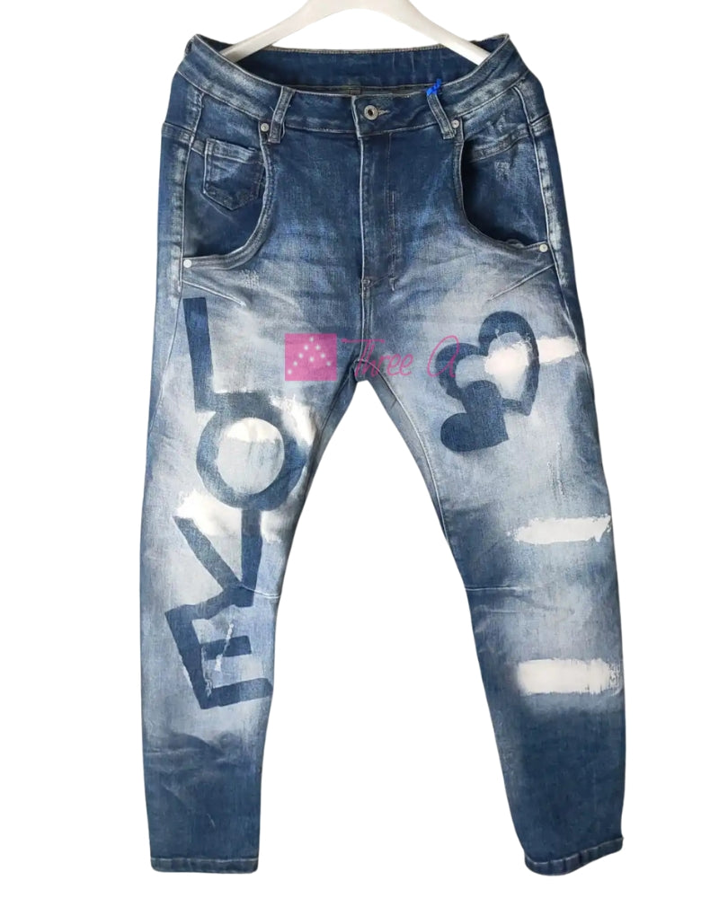 Jean Orya estampado por delante. Muy elásticos, recomiendo coger una talla menos de lo habitual, es tallaje italiano y talla grande. Cierra con cremallera