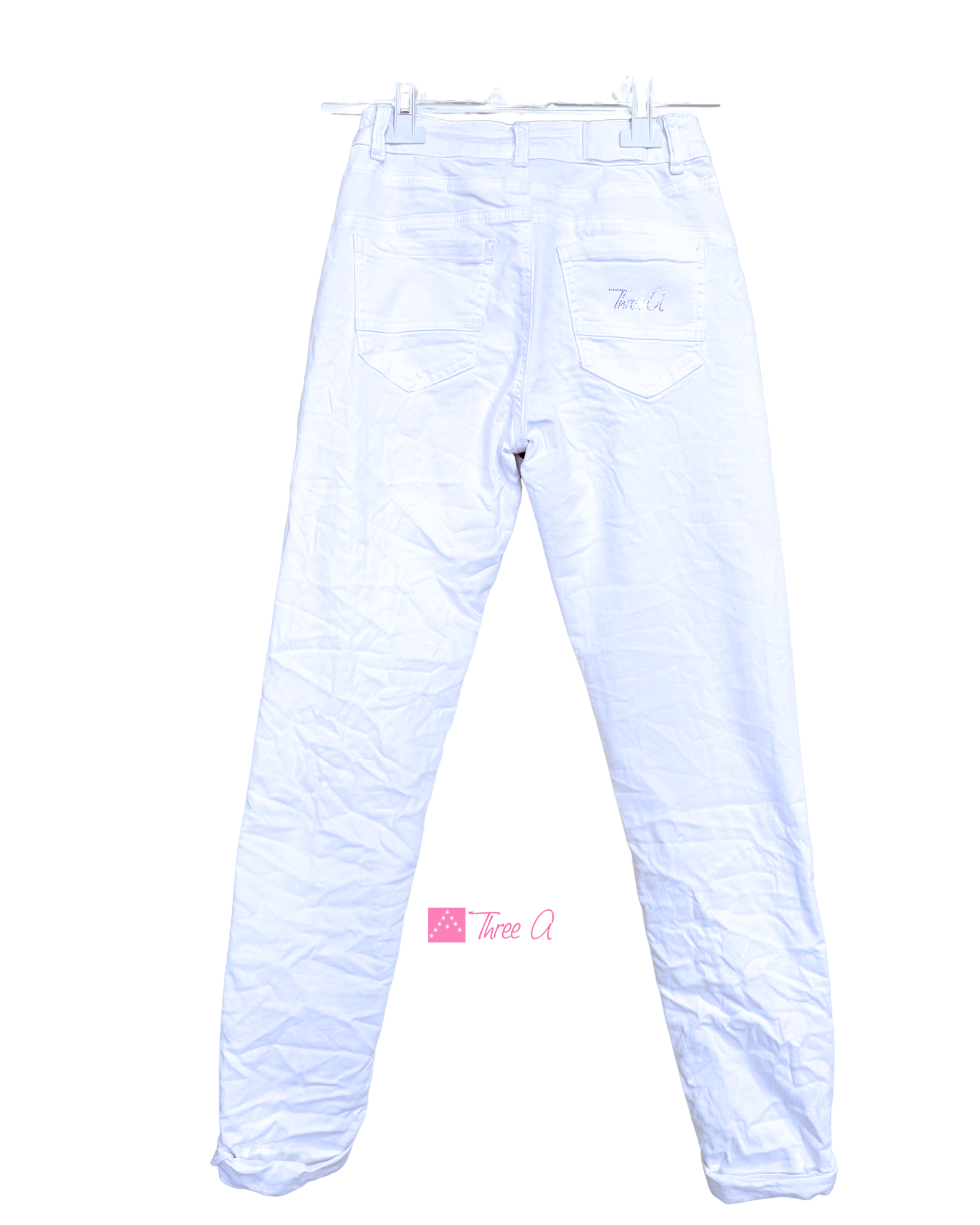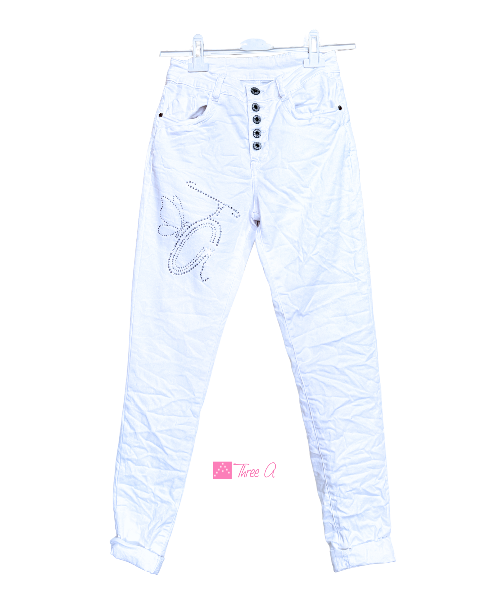 EXCLUSIVO Three A® Jean Princess con Strass, tipo pitillo, elásticos, tiro medio/alto, cierra con cremallera. Muy cómodos, estilizan! Detalle de nuestros diseños exclusivos con Strass.