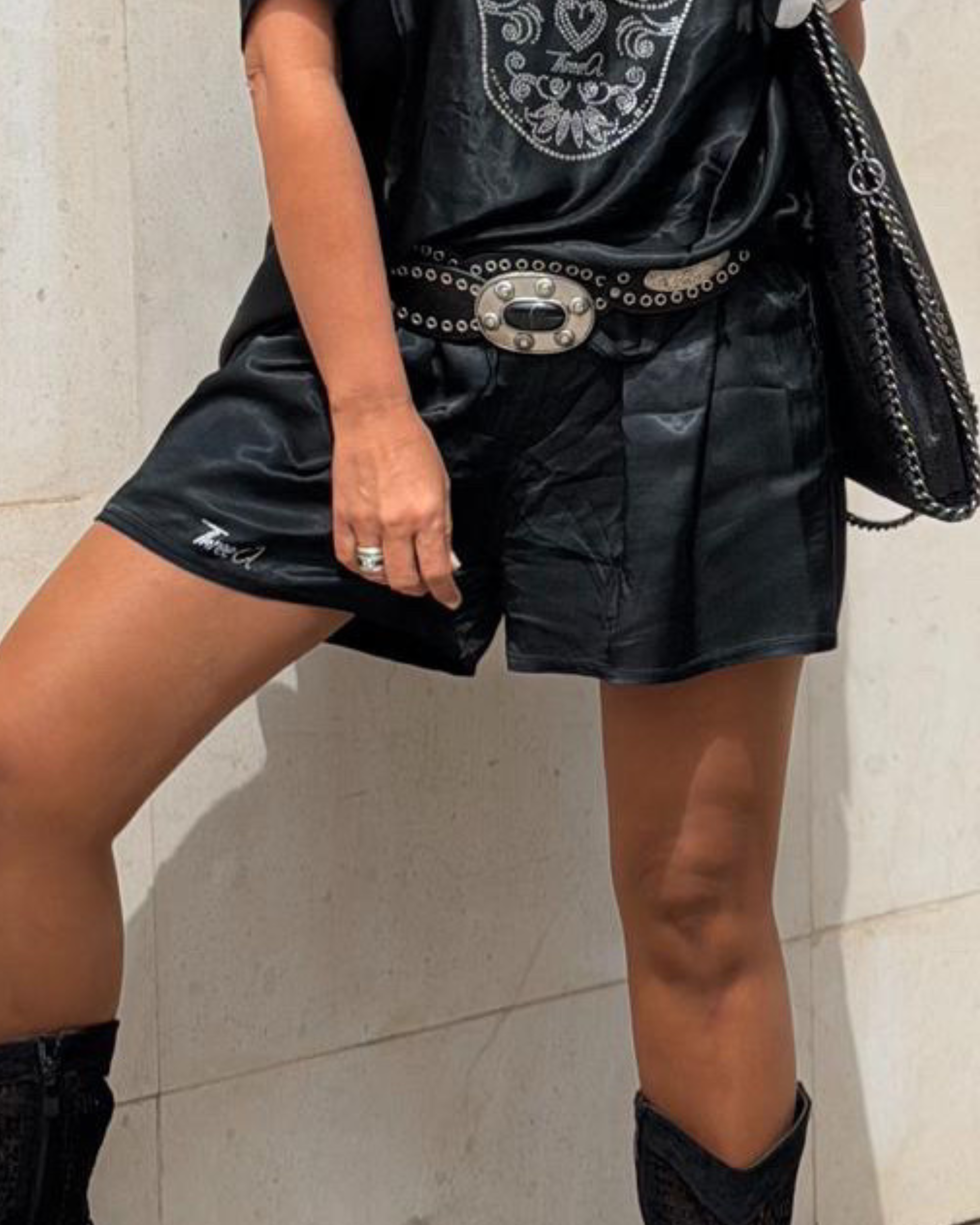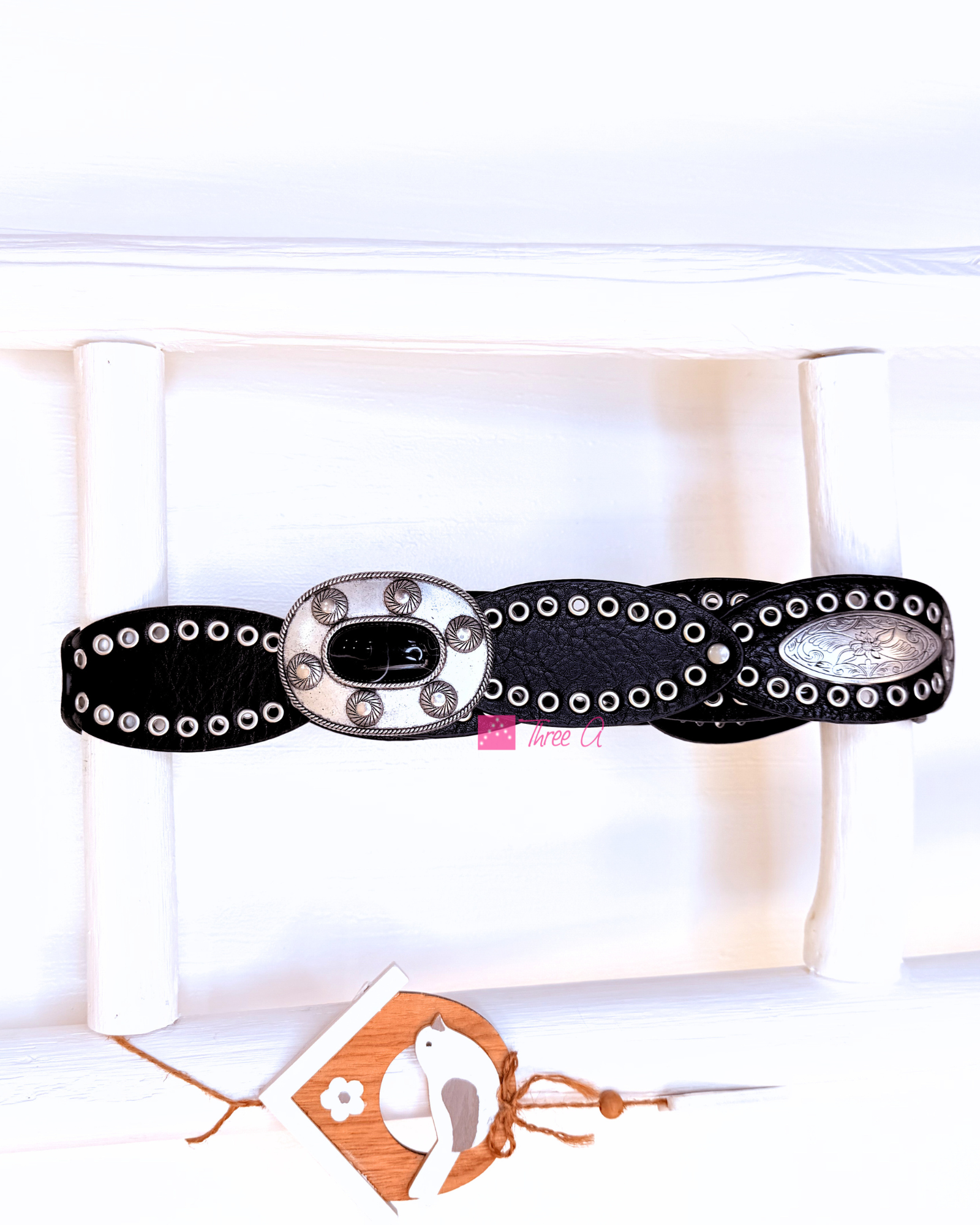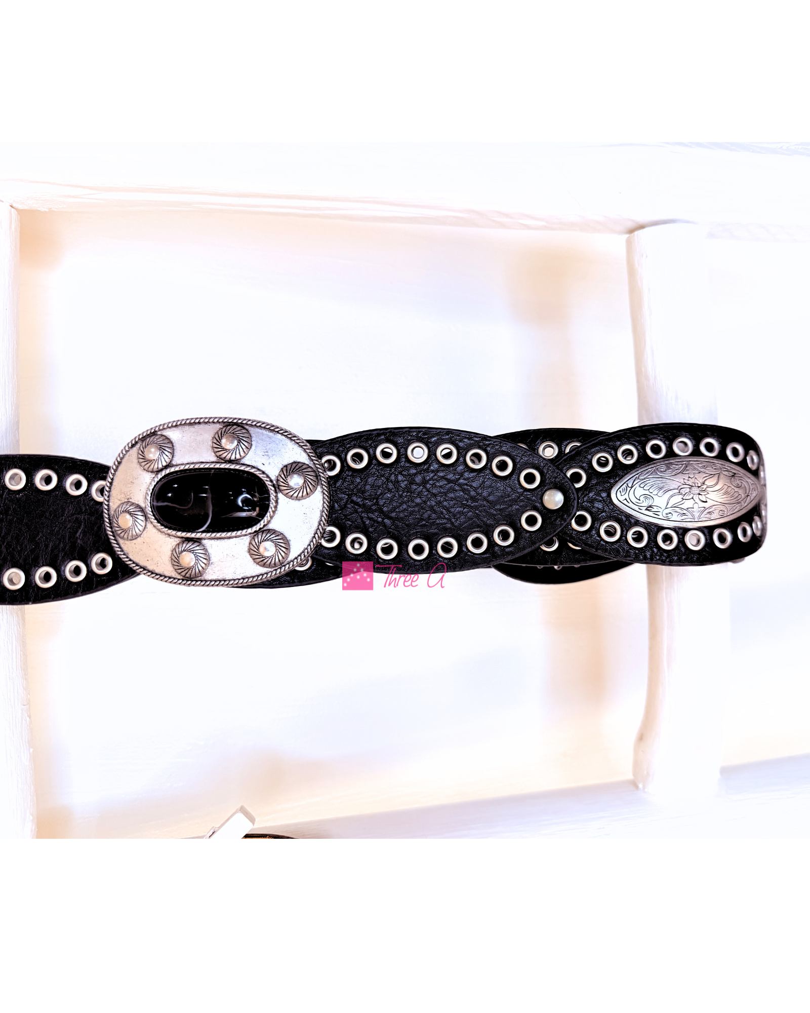 Cinturón Polipiel Belky con hebilla decorativa y remaches. La hebilla lleva un sistema de enganche como cierre, que puedes colocar en cualquier punto del cinturón, para poder regular a tu gusto.