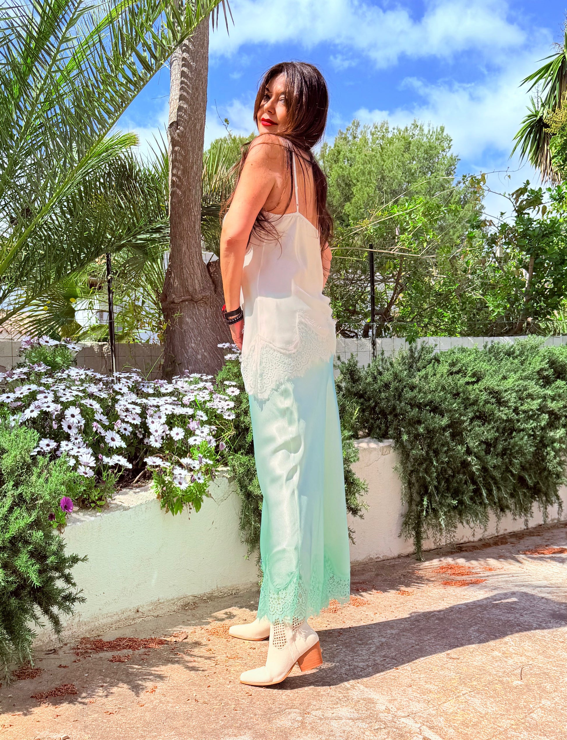 Lencero Tendence de viscosa con blonda en el escote cruzado y el bajo, elástico en la espalda, tirantes regulables, bajo asimétrico, efecto desgastado.
